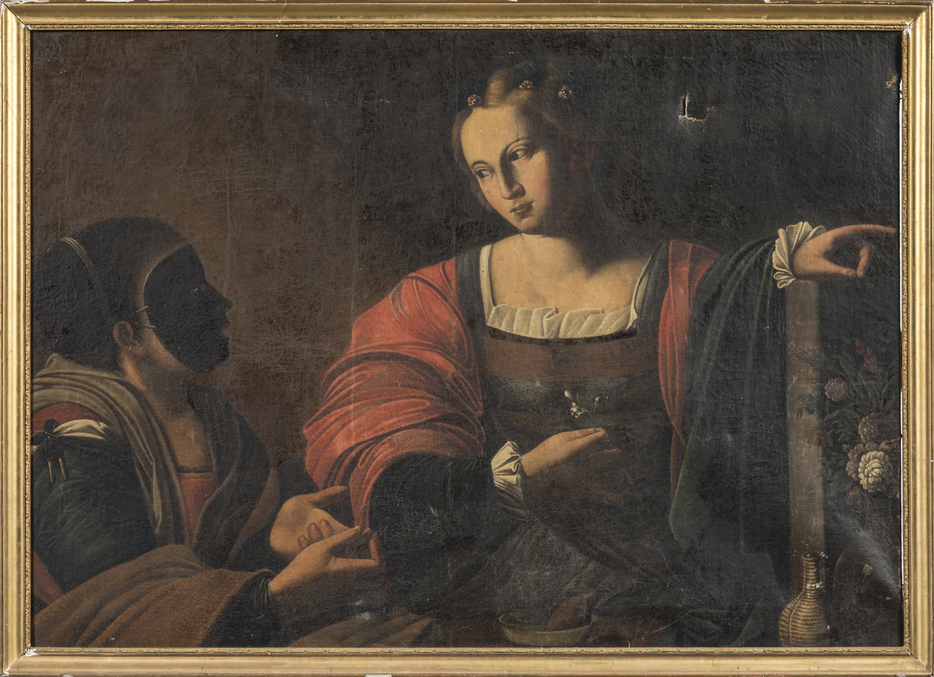 A portrait of a fortune teller after Carlo Saraceni. Oil on original canvas. Italian School, 18th century.