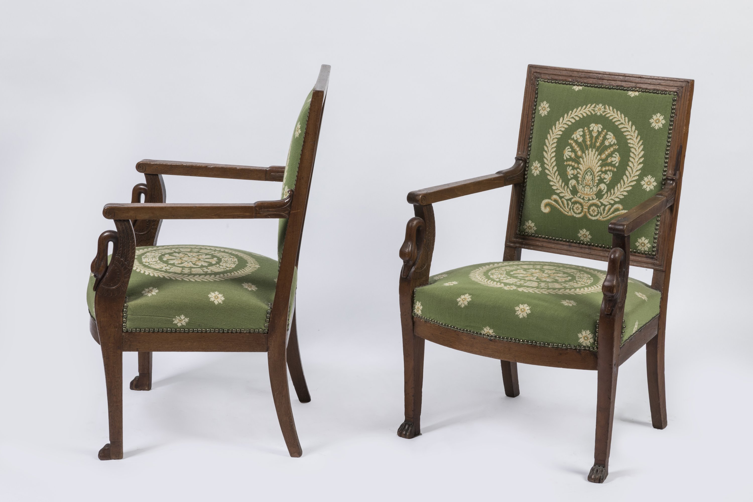 Il comprend quatre fauteuils et quatre chaises. Les accotoirs à col de cygne sont prolongés par des pieds gainés à griffes. Les dossiers plats rectangulaires sont moulurés.