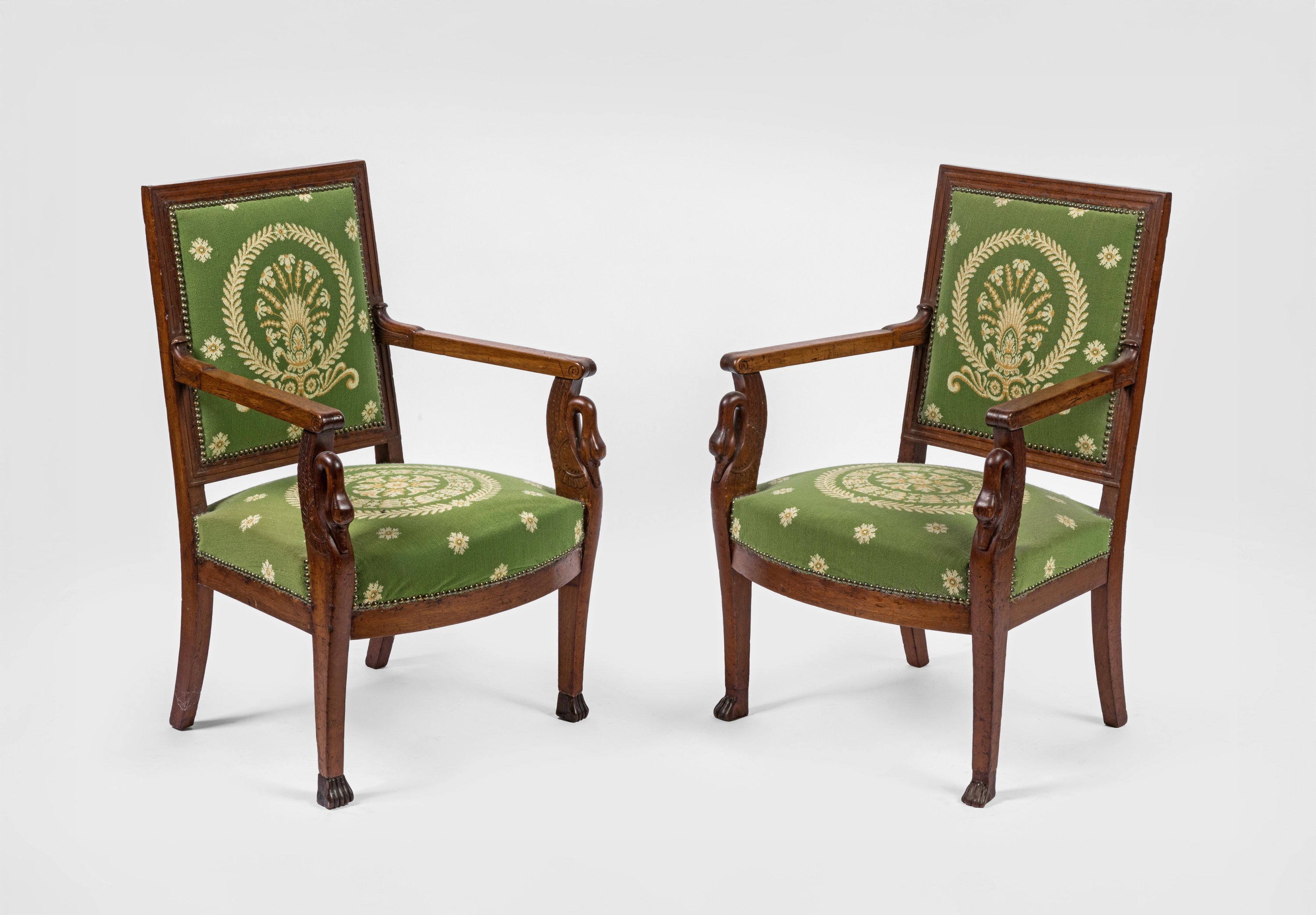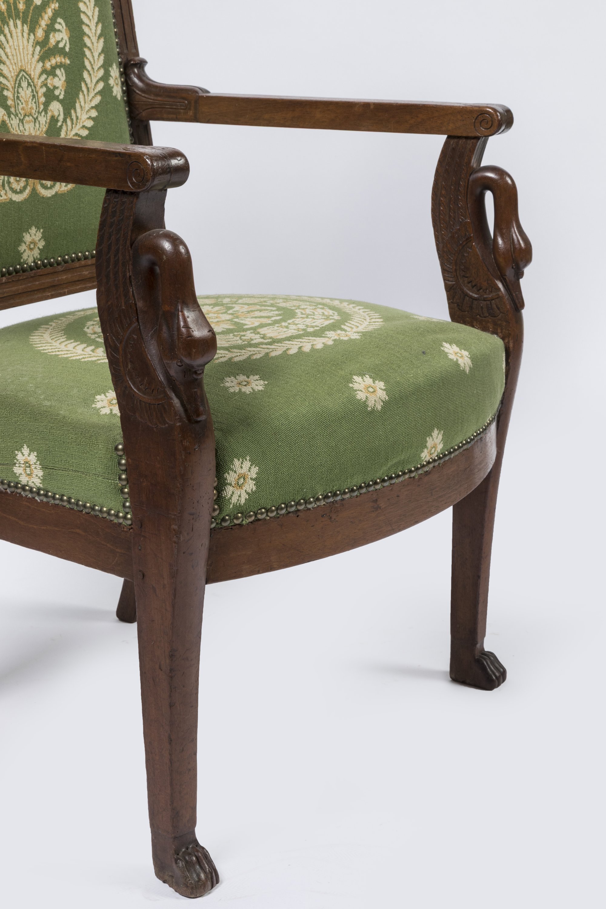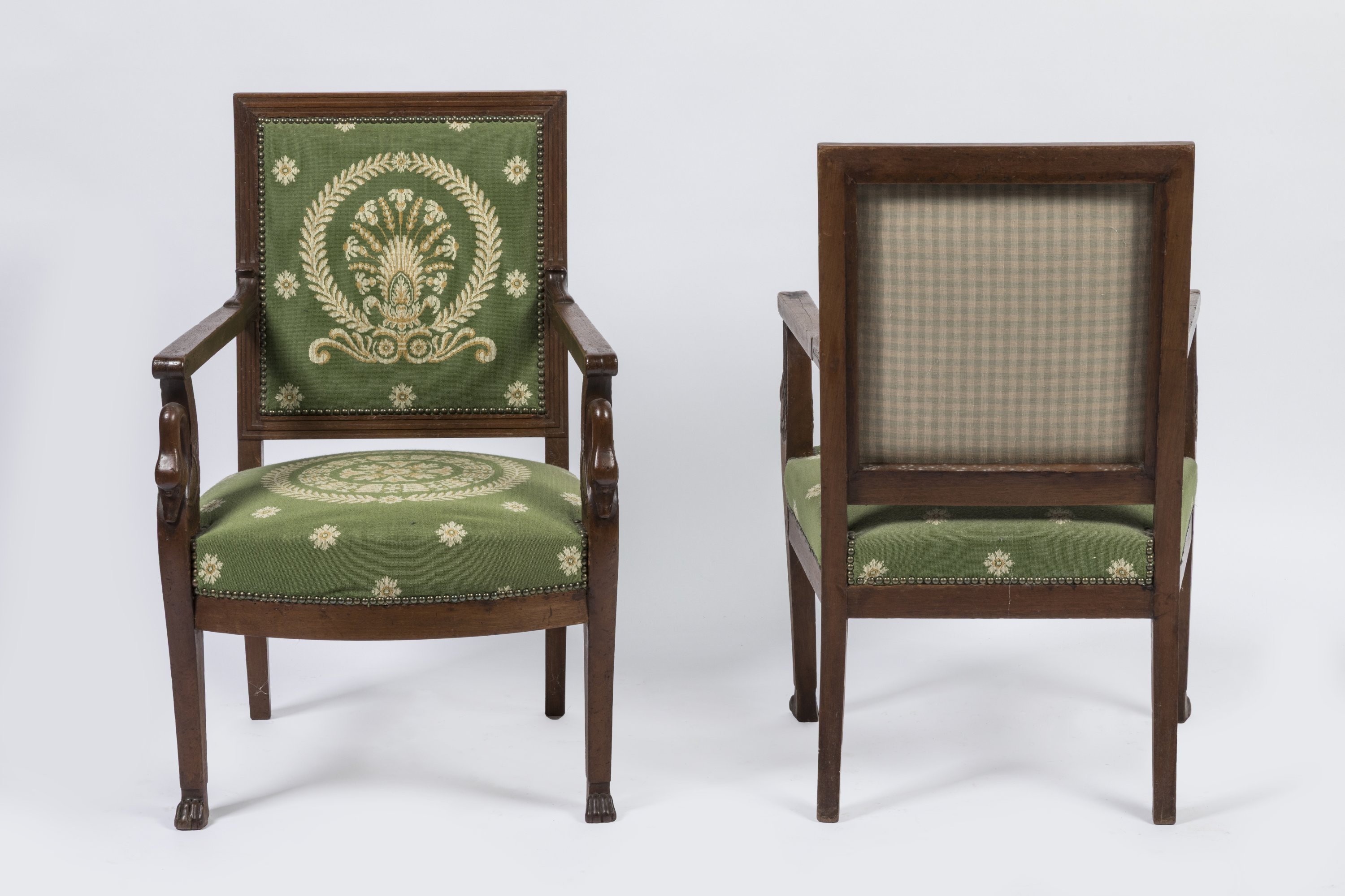 A set of four mahogany armchairs and four chairs. Green upholstery. Restauration Period.