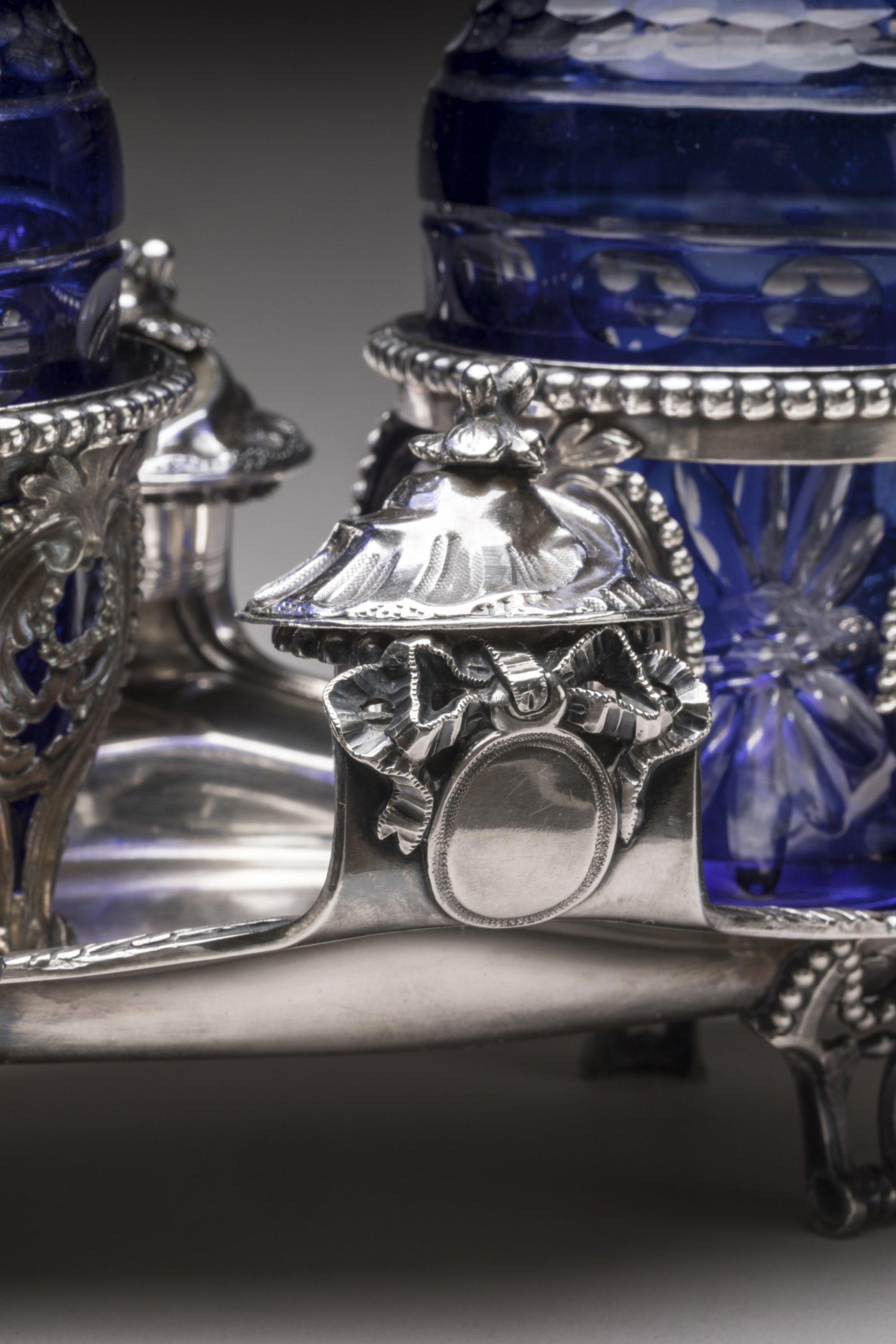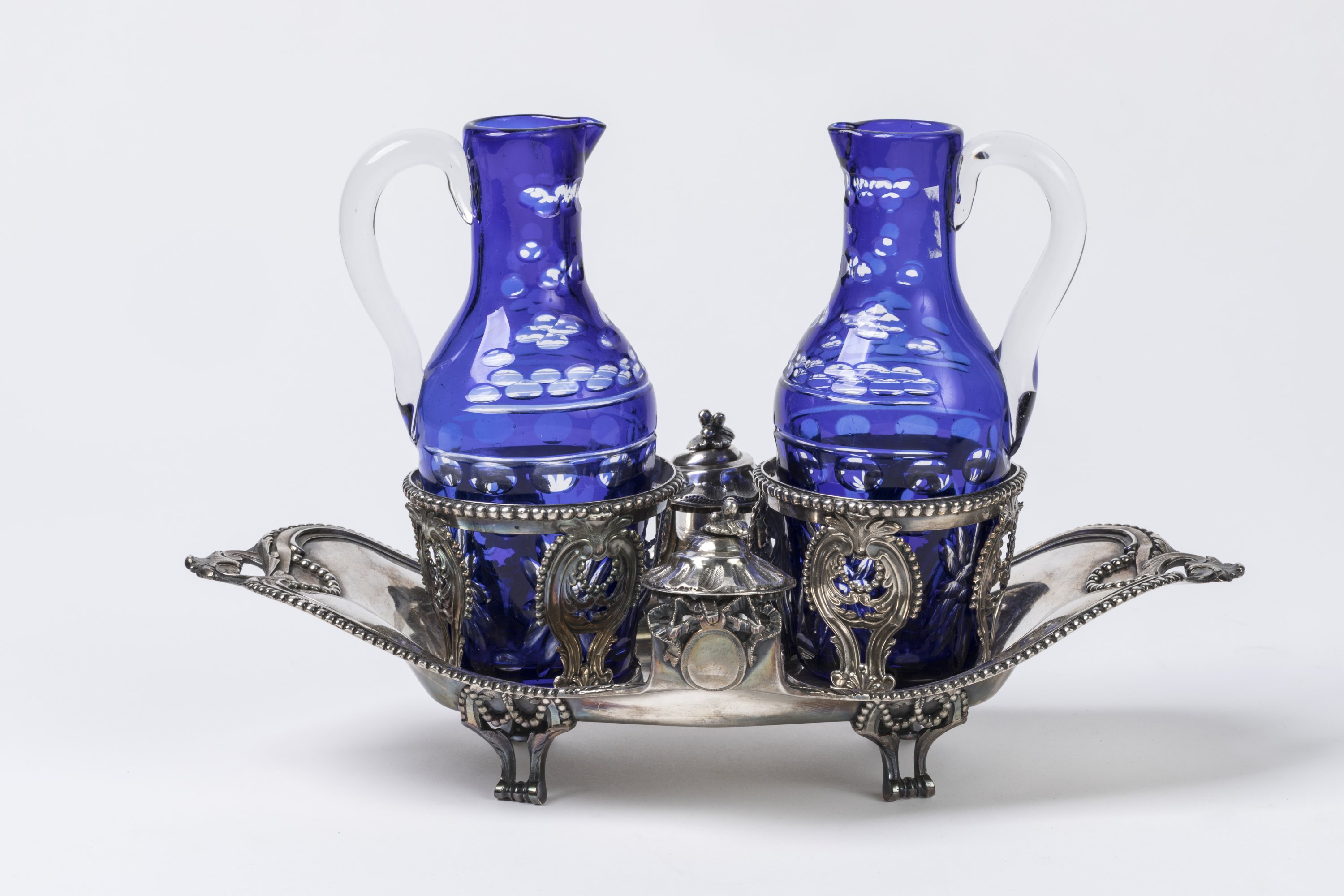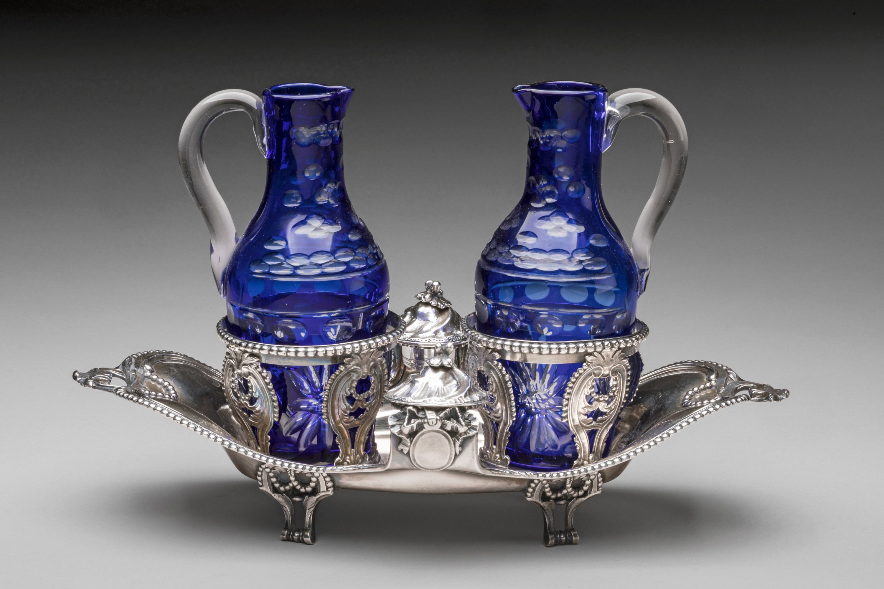 De forme mouvementée, la bordure est soulignée d'un rang de perles et se termine par deux anses à décor de feuilles d'acanthe. Les supports des bouchons sont surmontés de noeuds et médaillons. Il repose sur quatre pieds en enroulements.