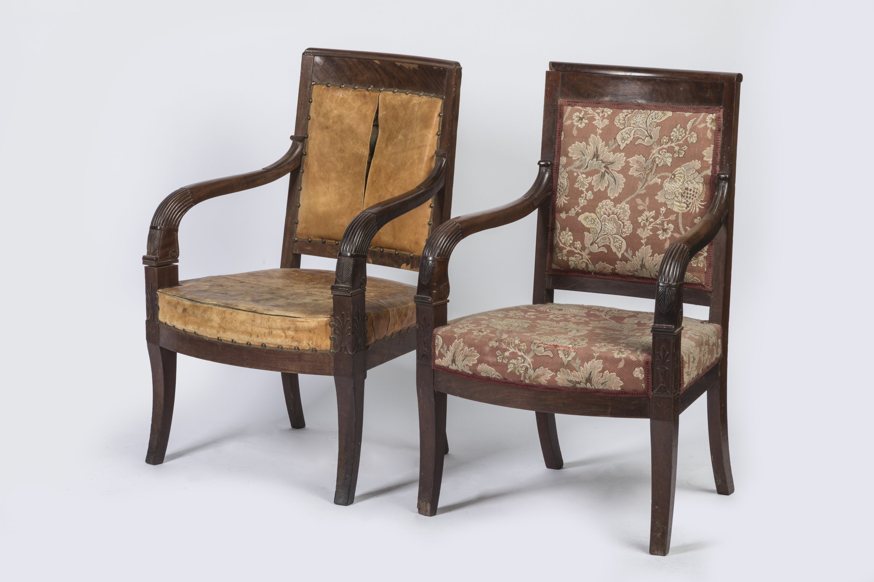 A set of four moulded and carved mahogany armchairs. Empire Period, early 19th century.