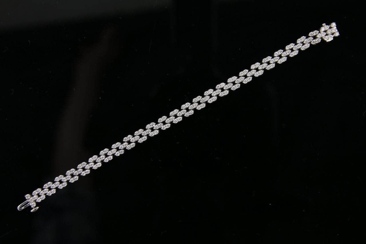 Or gris 750 millièmes décoré de trois lignes de diamants ronds de taille brillant, les maillons de forme navette.