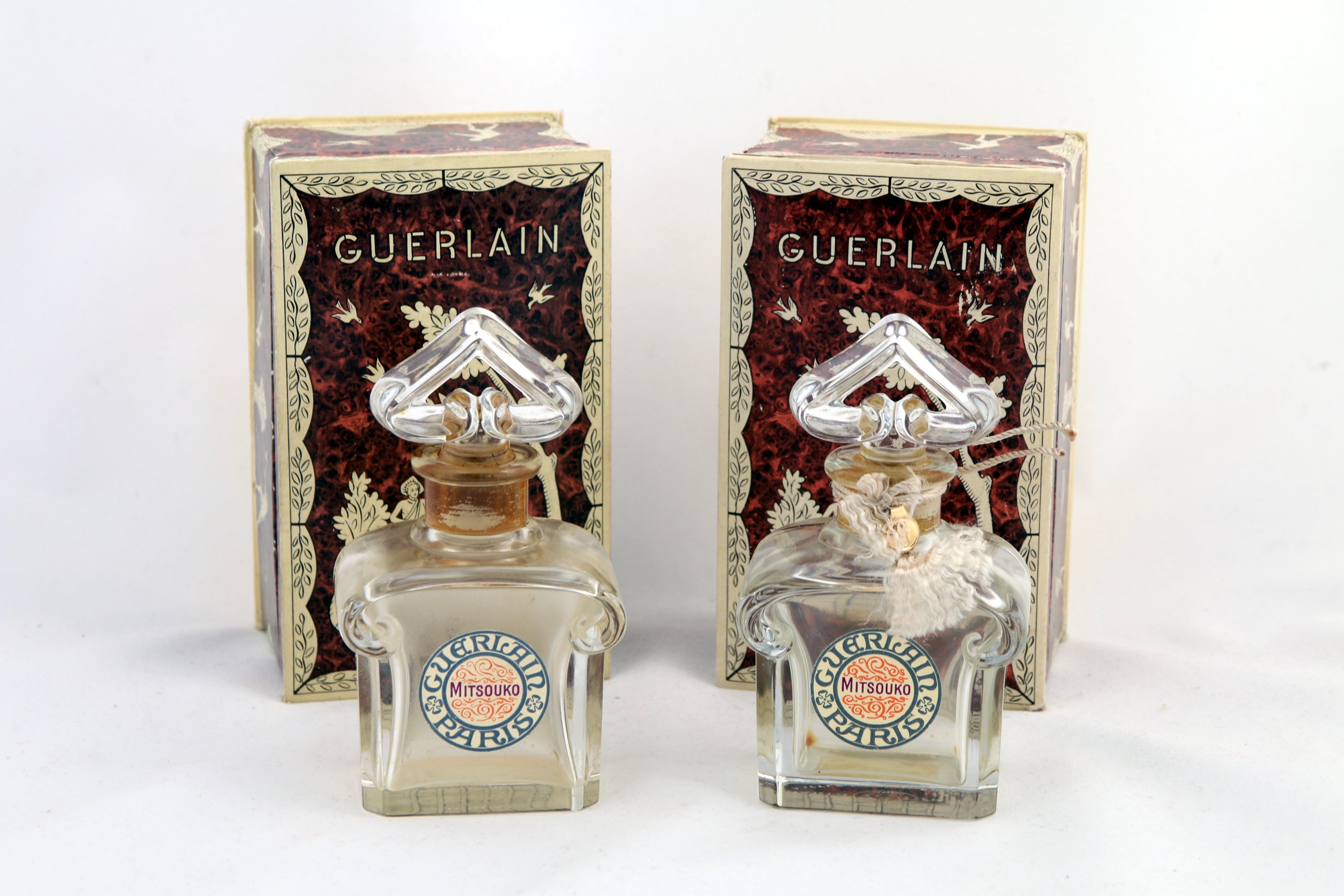 Quatre flacons en cristal incolore pressé-moulé de Baccarat, de section rectangulaire, leur panse cubique ornée de quatre volutes, col à carnette, coiffés de leur bouchon "cœur évidé" en cristal incolore ; chacun avec son étiquette polychrome numérotée, présentés dans leur coffret rectangulaire en carton gainé de papier polychrome, titré et illustré de scènes de chasse et de pêche.