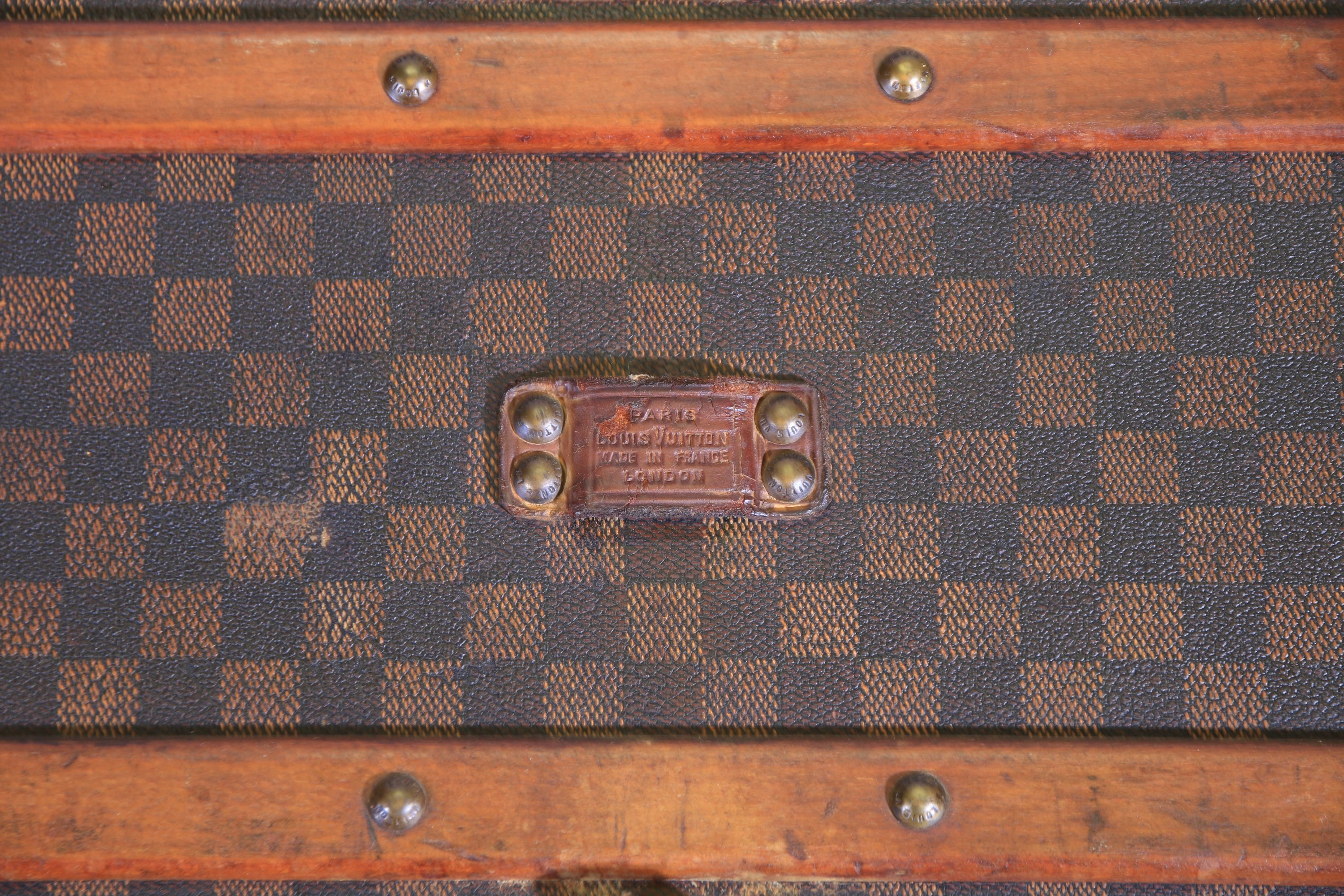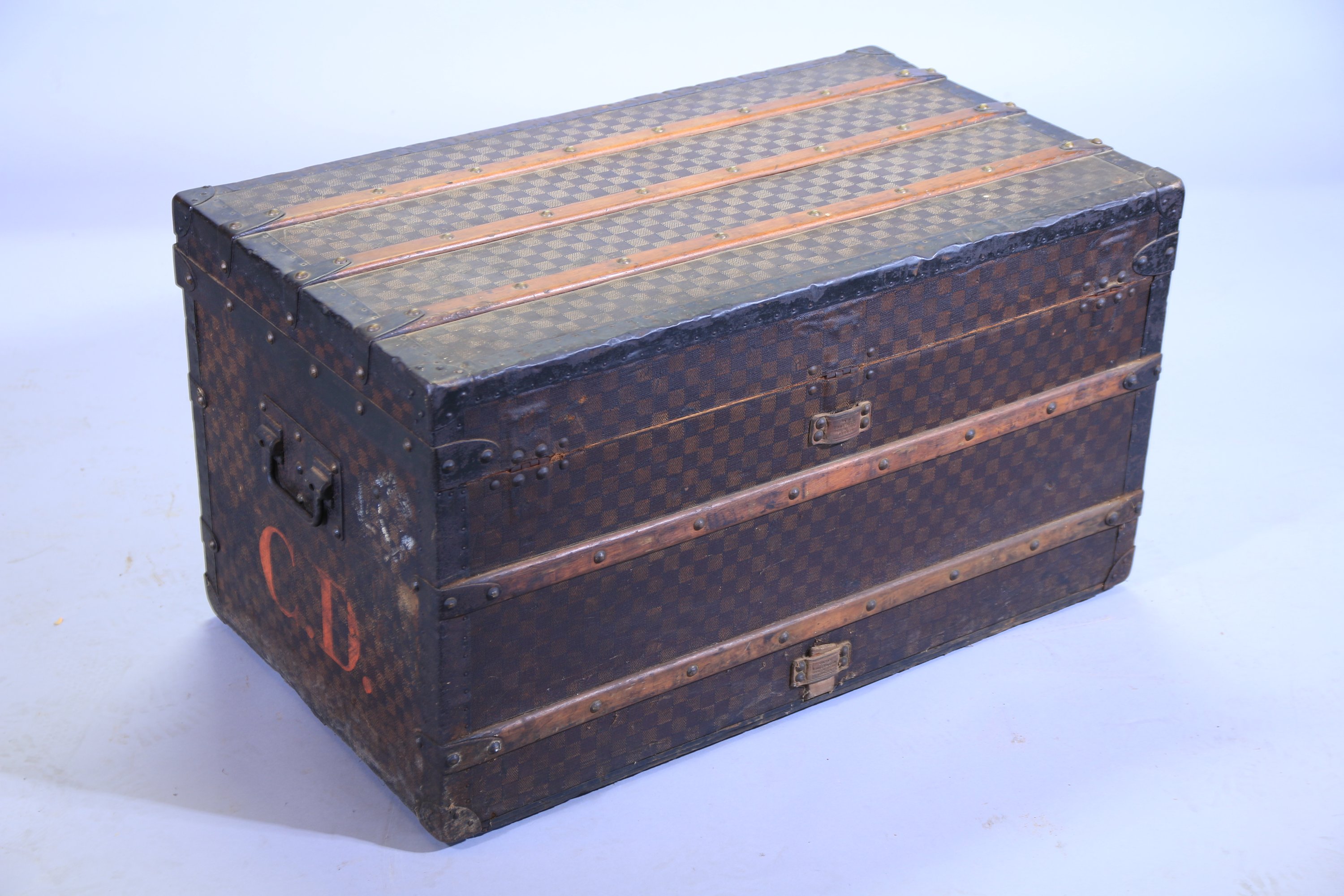 Bois gainé d'une toile enduite dite "damier", renforcé de bois cloutés de laiton et finition "mauresque". Garniture interne à croisillons capitonnés. Etiquette intérieure "Louis Vuitton / 1 rue Scribe 149 , New Bond St London" et numérotée "200535". Poignées latérales en laiton et monogramme "C.D."