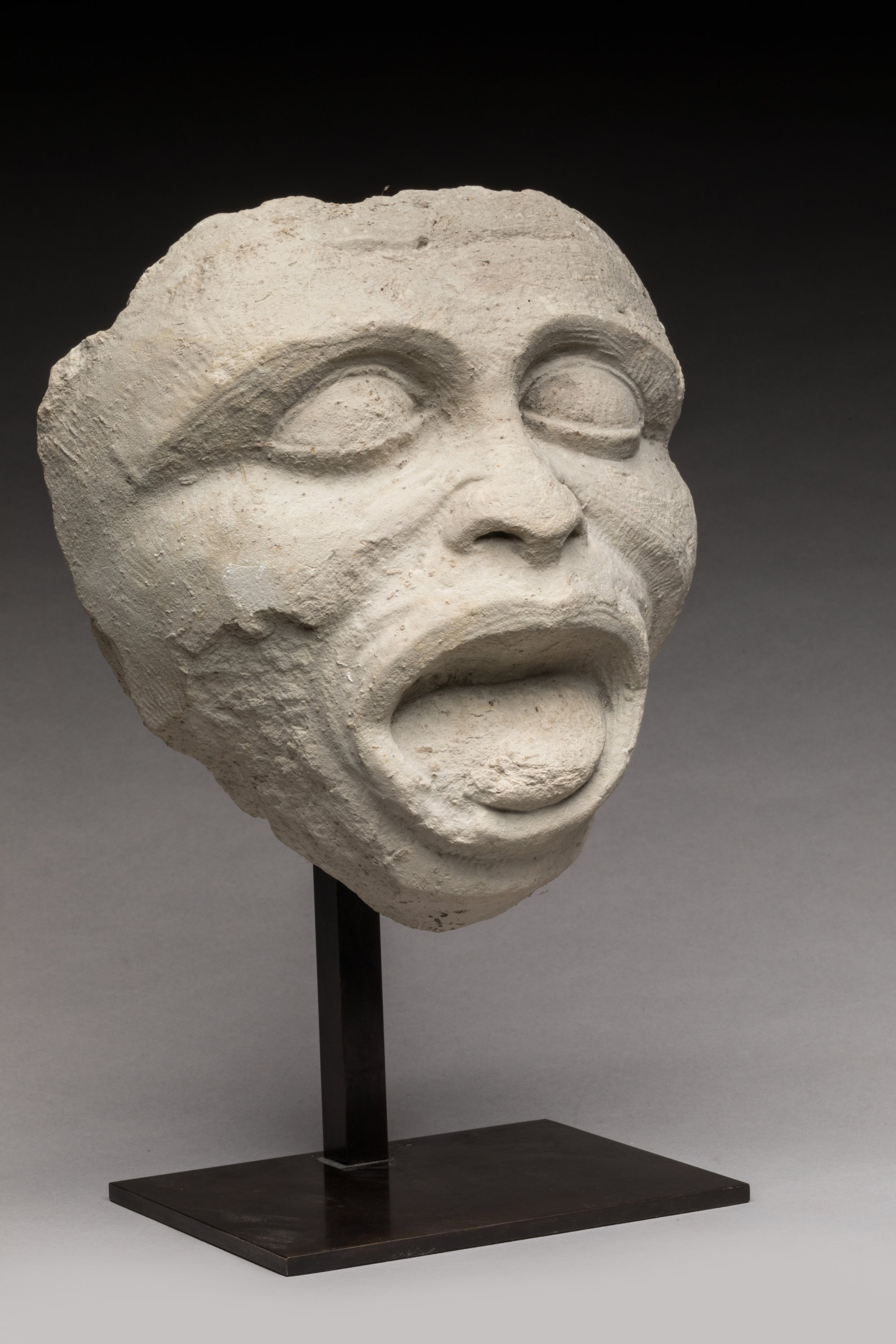 Pierre calcaire sculptée représentant une tête aux yeux proéminents en amande bordés de paupières épaisses, sillons nasaux marqués, nez épaté, bouche ouverte montrant la langue.