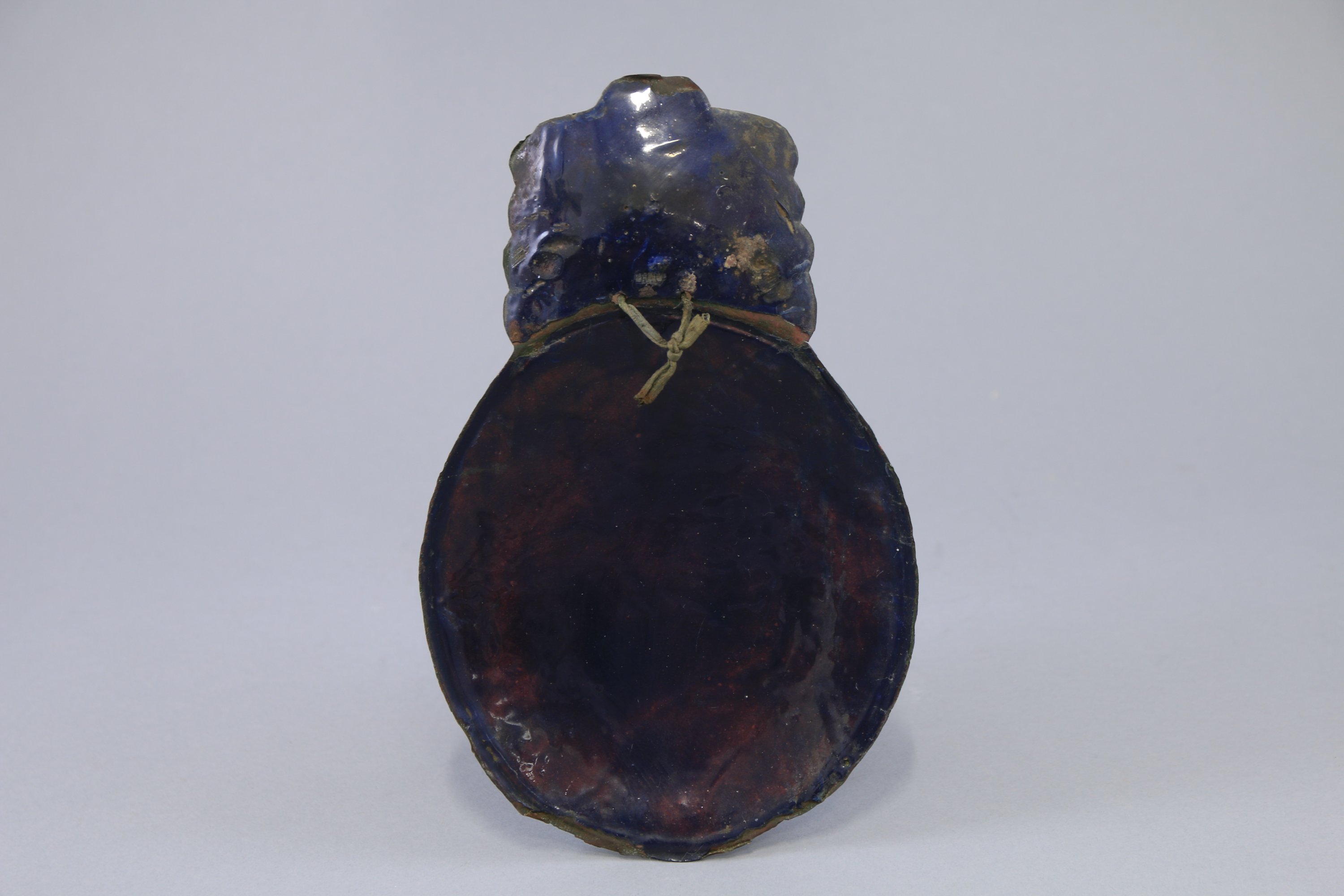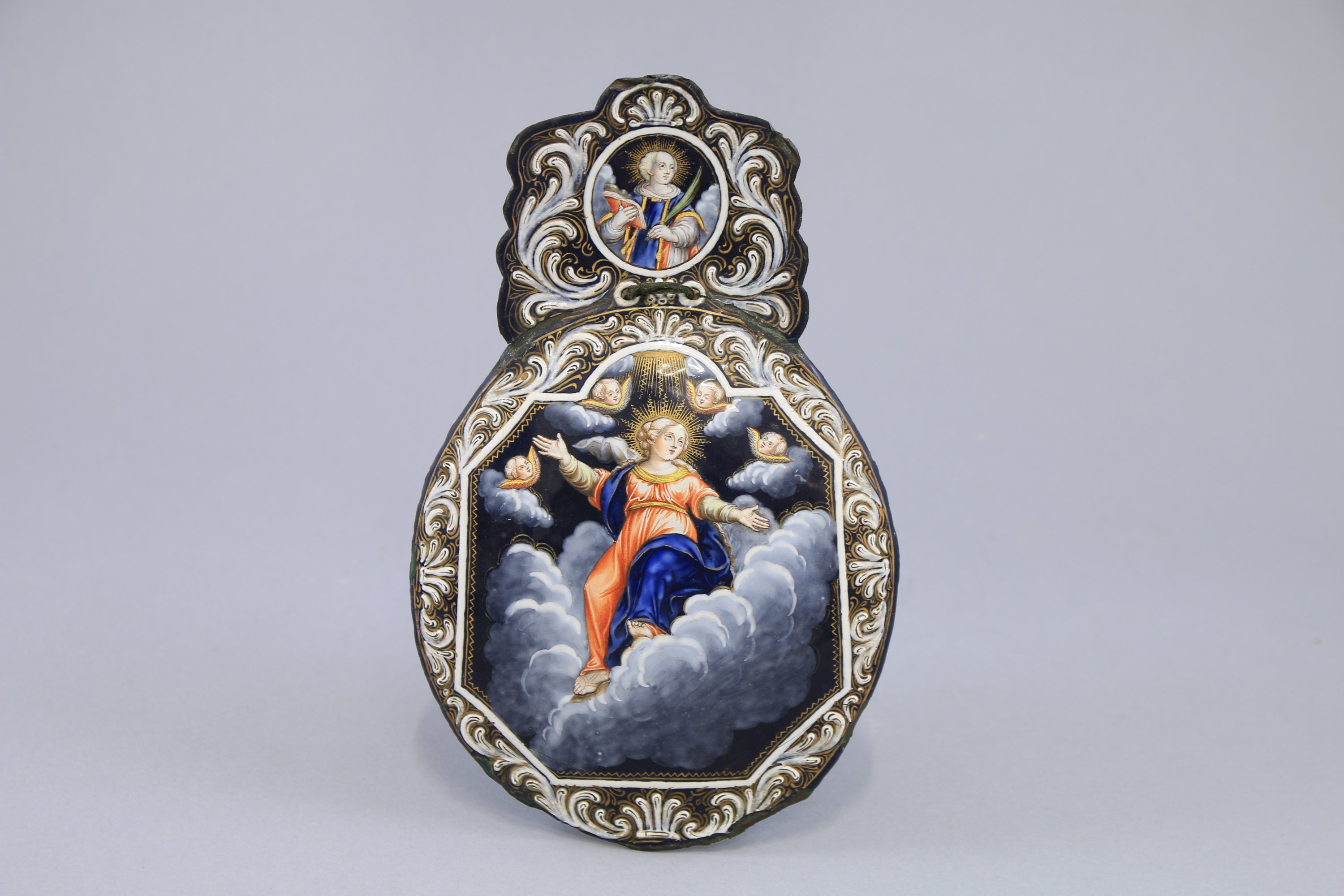 Email peint polychrome avec rehauts d’or, de forme ovale, représentant l’Assomption de la Vierge entourée de têtes d’angelots dans un encadrement octogonal à ressaut bordé de motifs rocaille en relief. Contre-émail violacé.