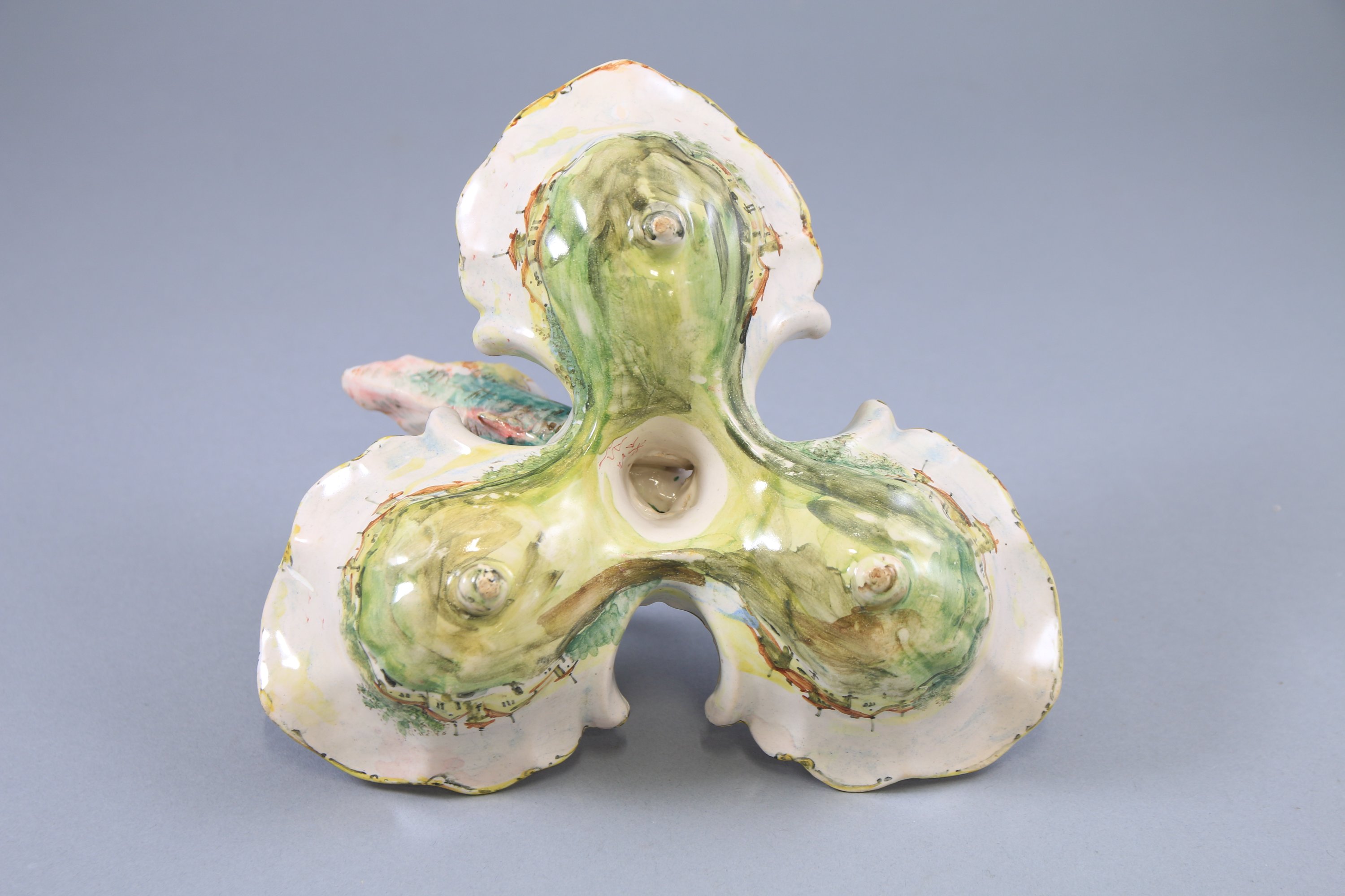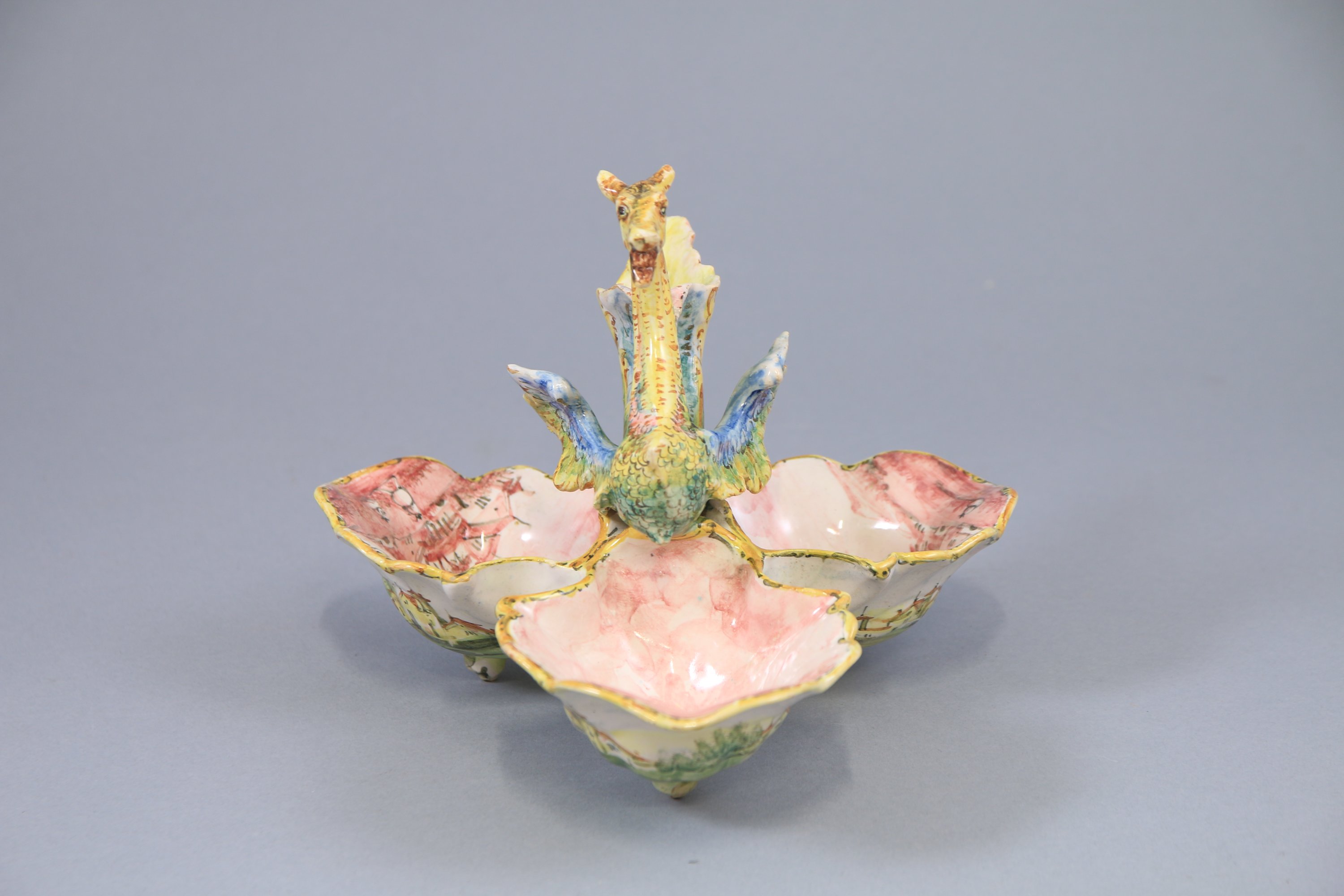 Céramique polychrome. A trois compartiments décorés de personnages et bâtiments surmontés d'un hippocampe.