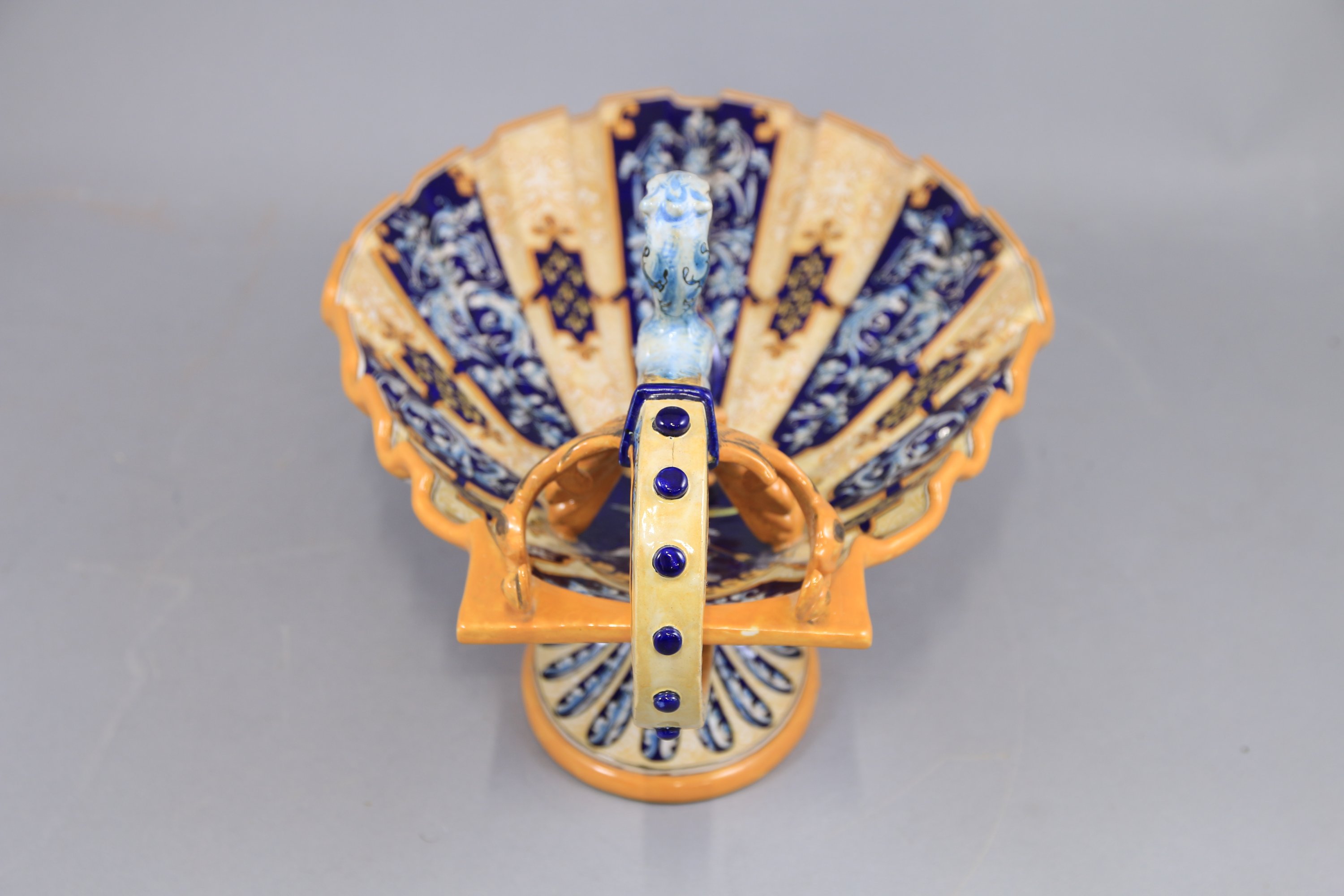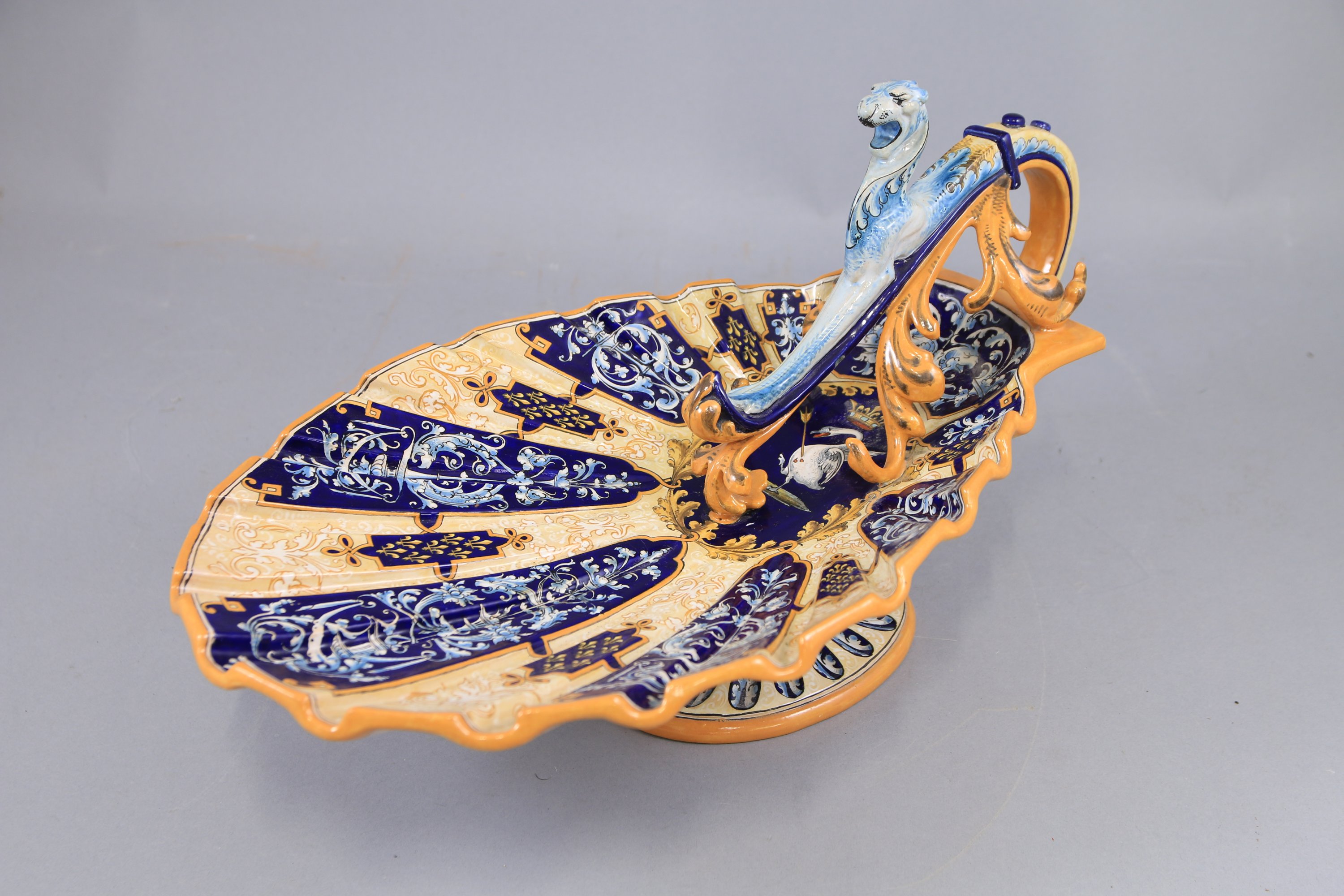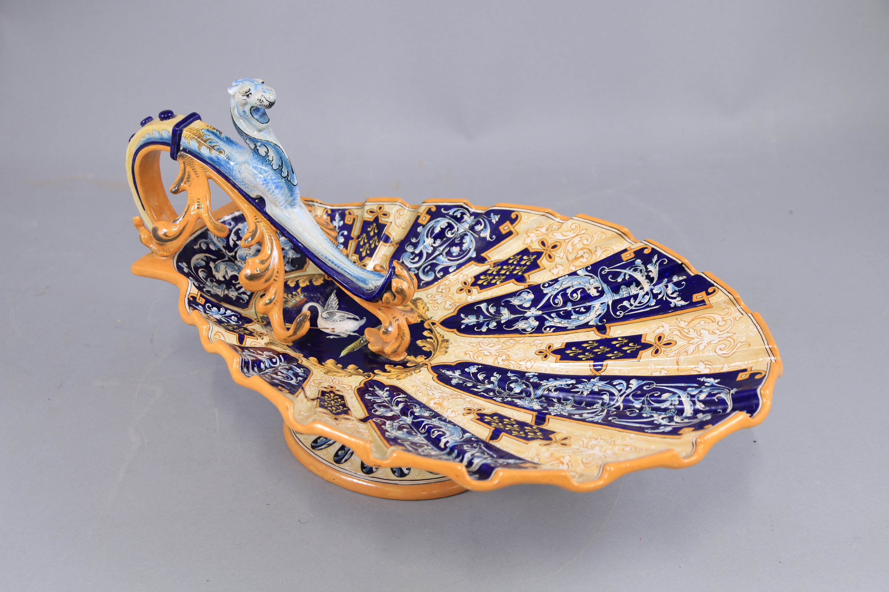 Faïence à décor de rinceaux bleus en alternance avec un motif de fleurs de lys et au cygne de Claude de France. L’anse en forme de chimère, pied oblong.