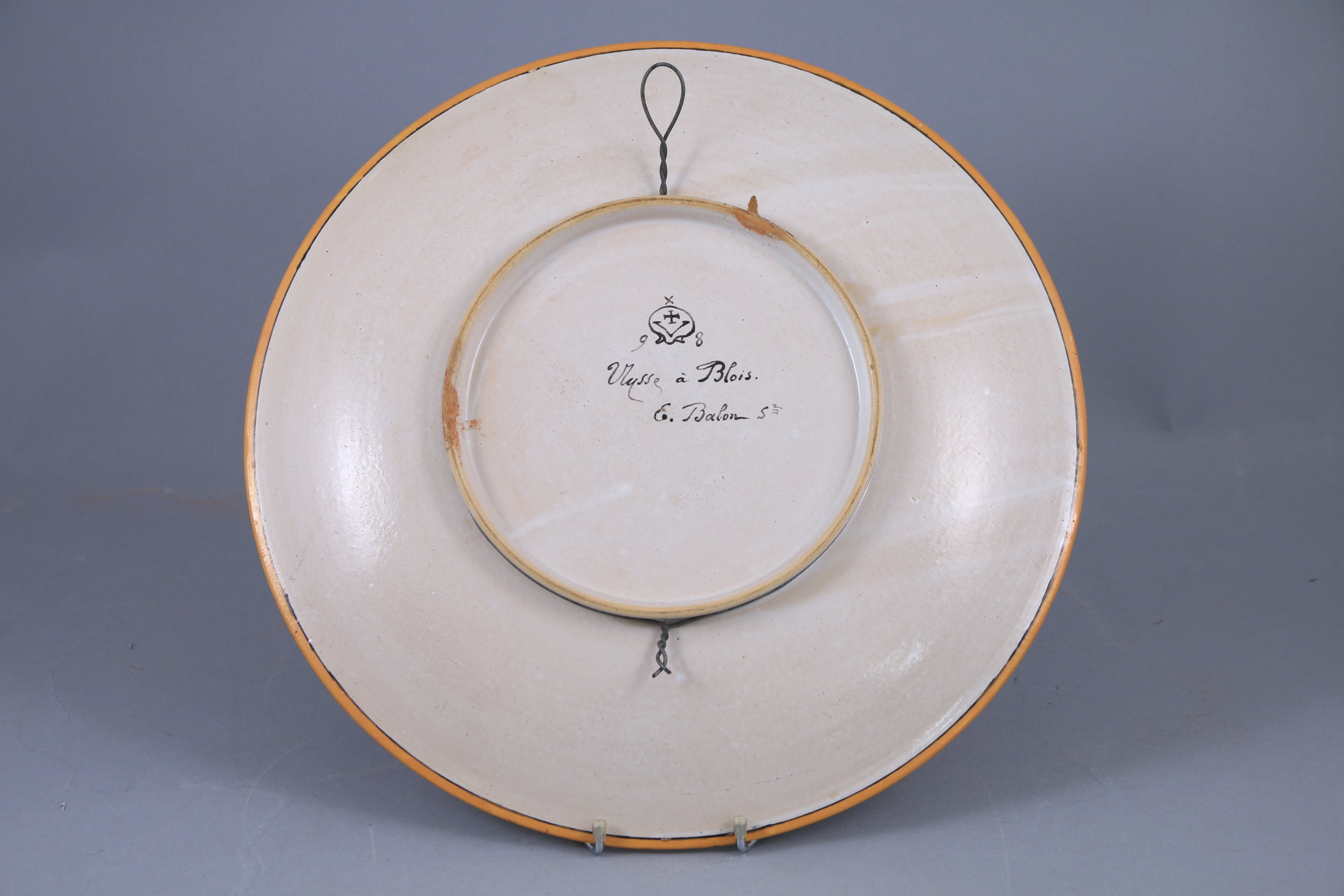 Faïence polychromée à décor des Armes de France sur fond d'un semi d'hermines. L'aile est décorée de fleurs de lys en alternance de feuilles d'acanthe.