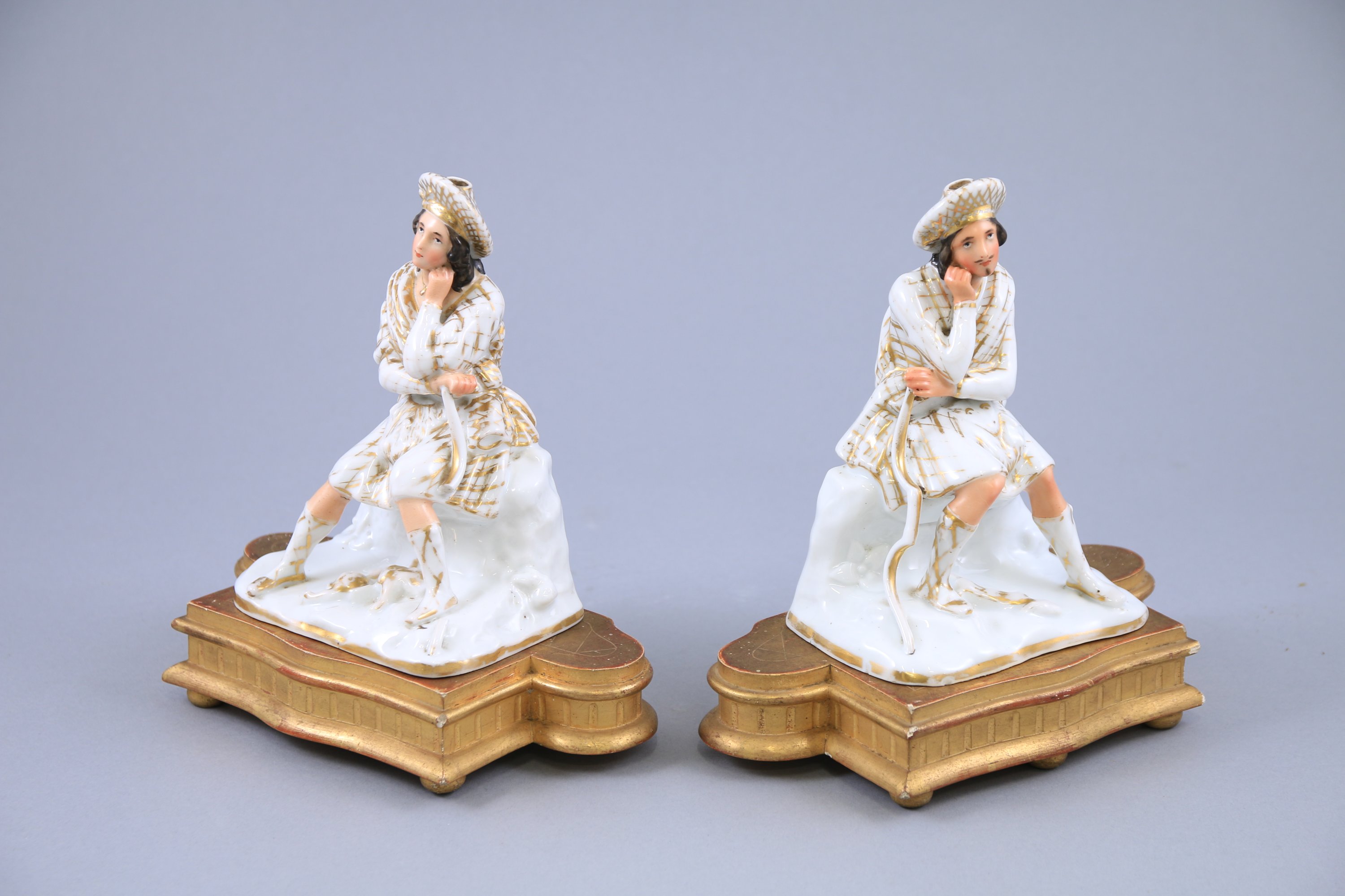 Paire de flacons à décor polychrome, blanc et or. L'air pensifs appuyés sur leurs arcs, aux pieds de l'un se trouve deux oiseaux et de l'autre un lapin.