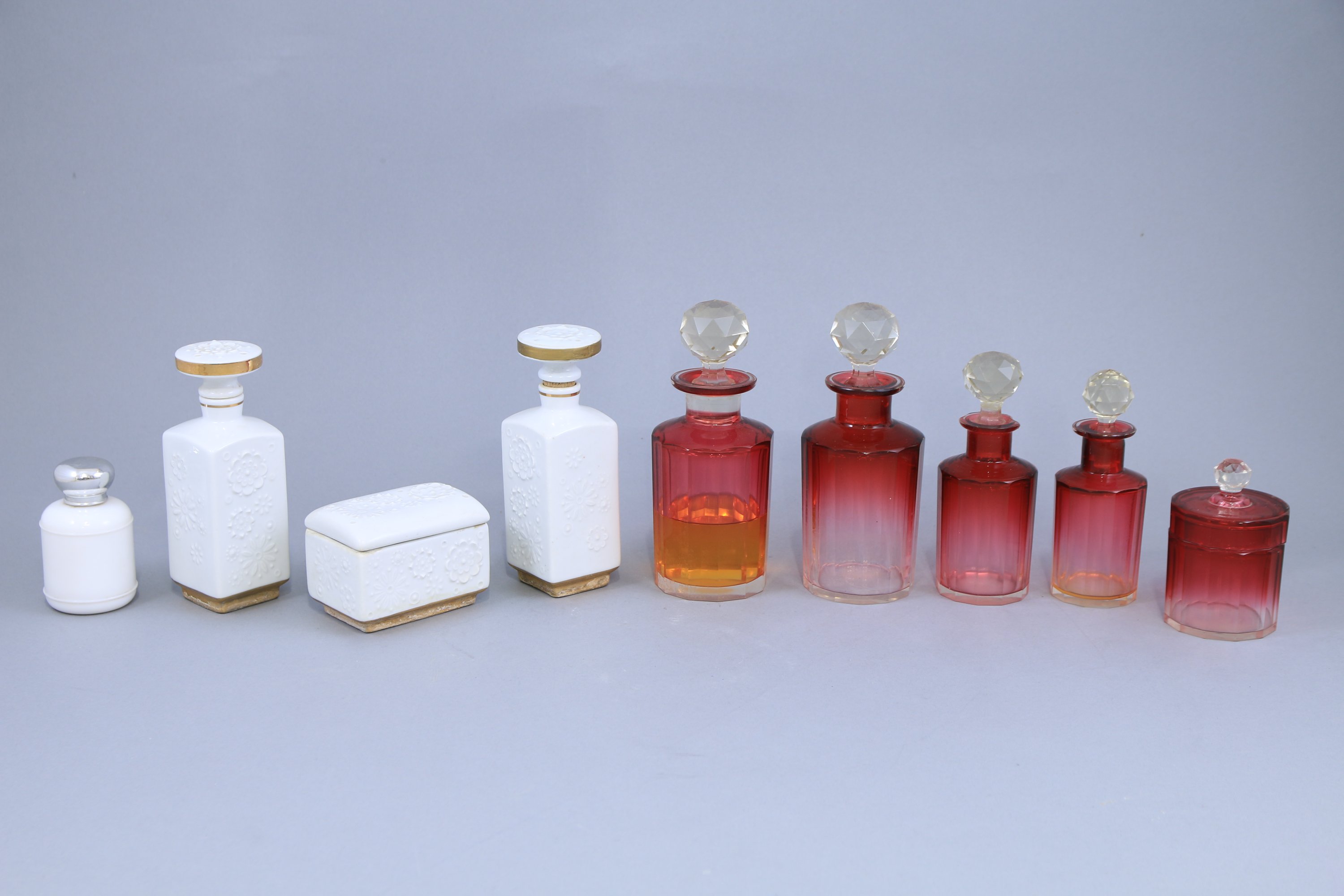 - un en verre teinté rouge à pans coupé comprenant quatre flacons et une boite couverte. Haut. de 11 à 19 cm.