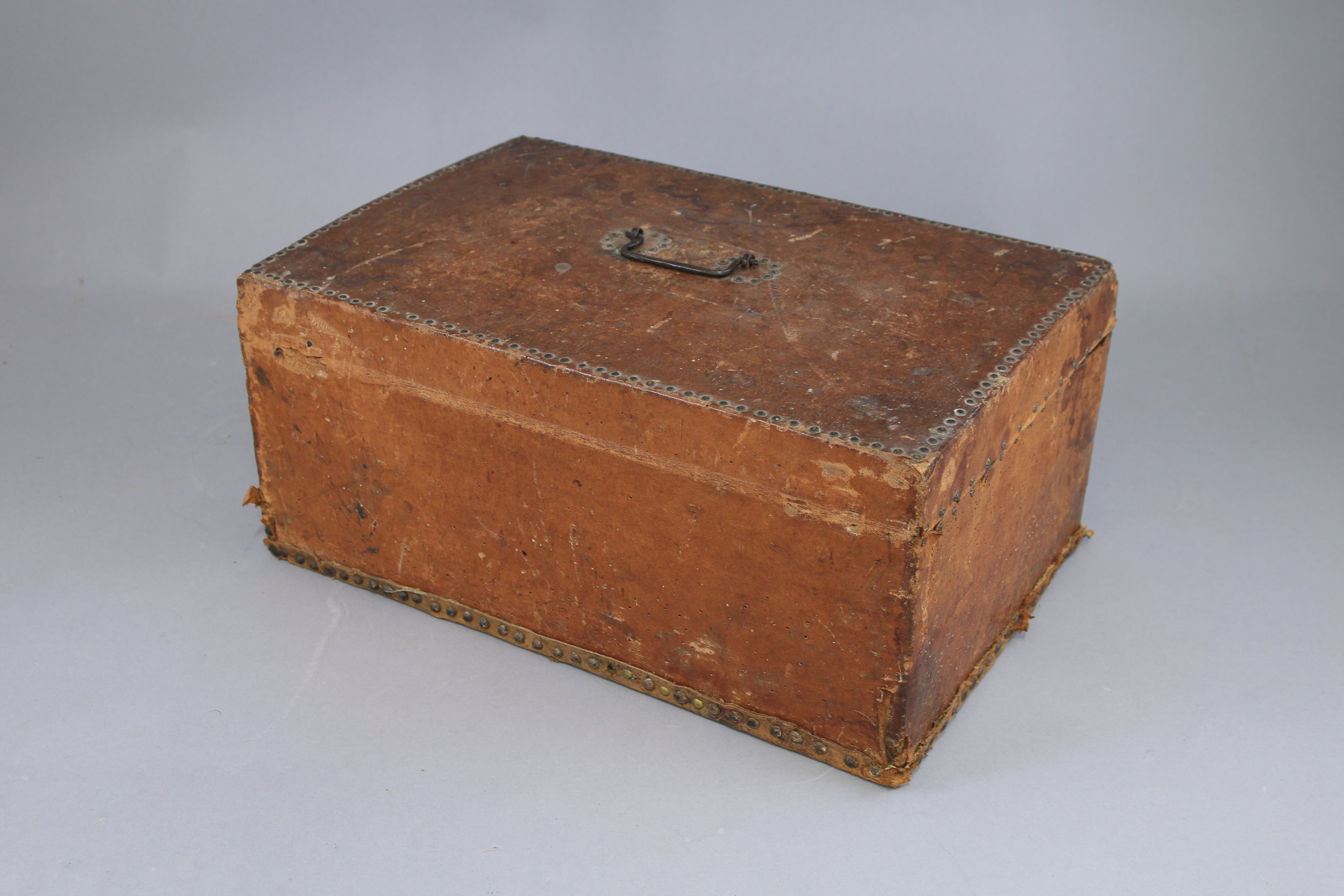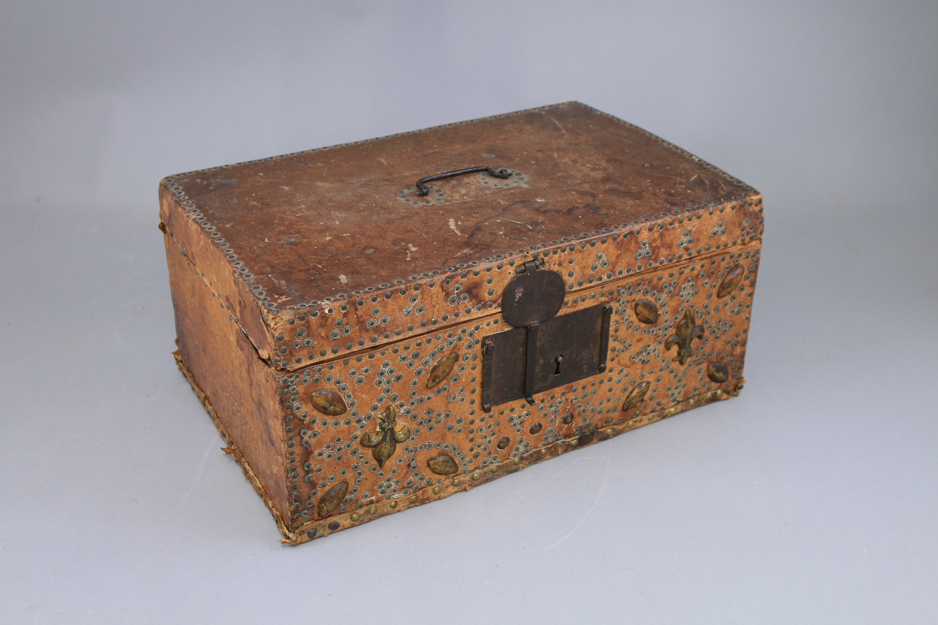 Ame en bois recouvert de cuir à décor clouté en façade dont deux figurant des fleurs de lys, poignée sommitale et moraillon en fer forgé.