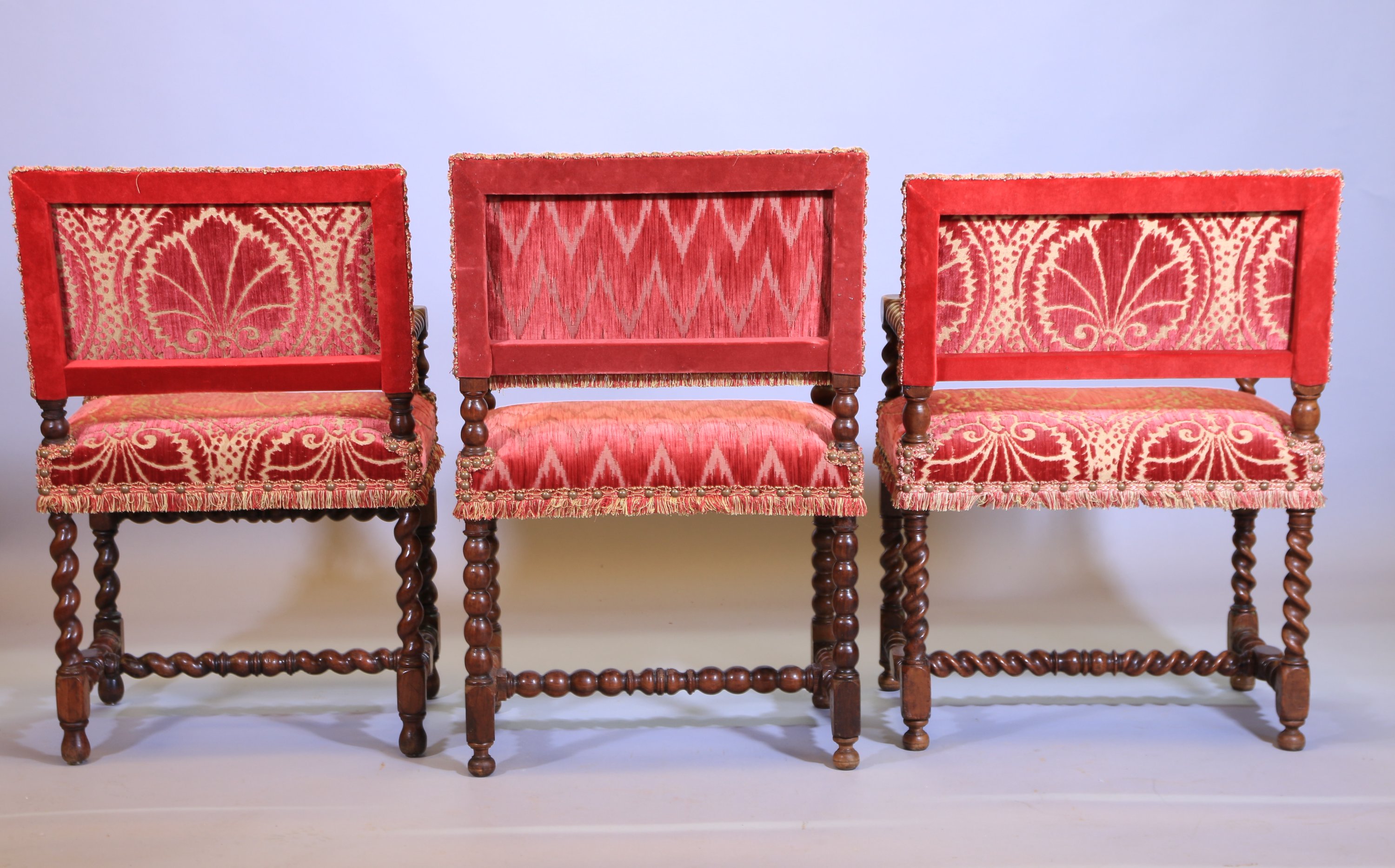 Noyer mouluré et sculpté. Accotoirs et pieds torsadés pour deux et en chapelet pour le dernier reliés par une entretoise en H.