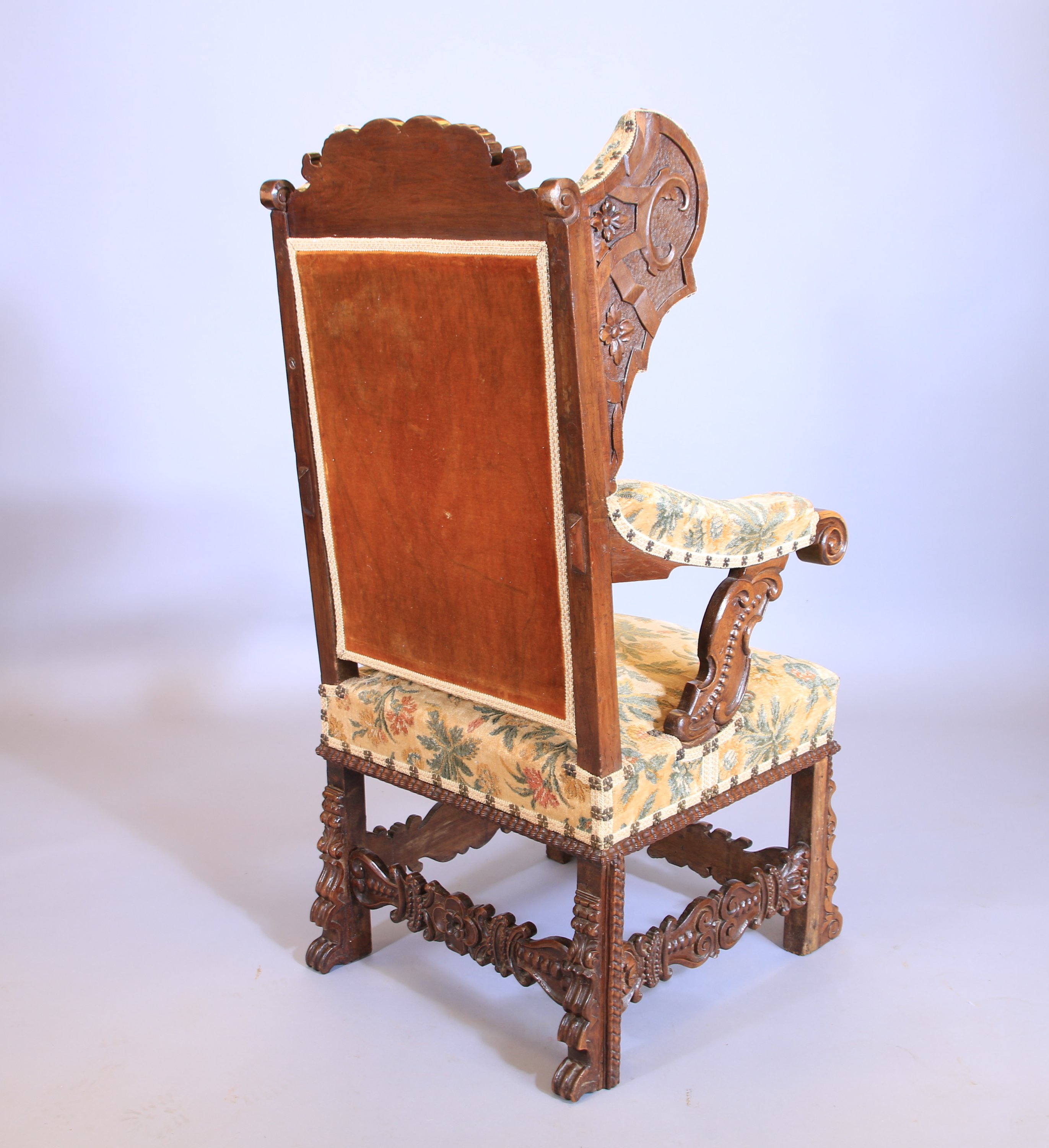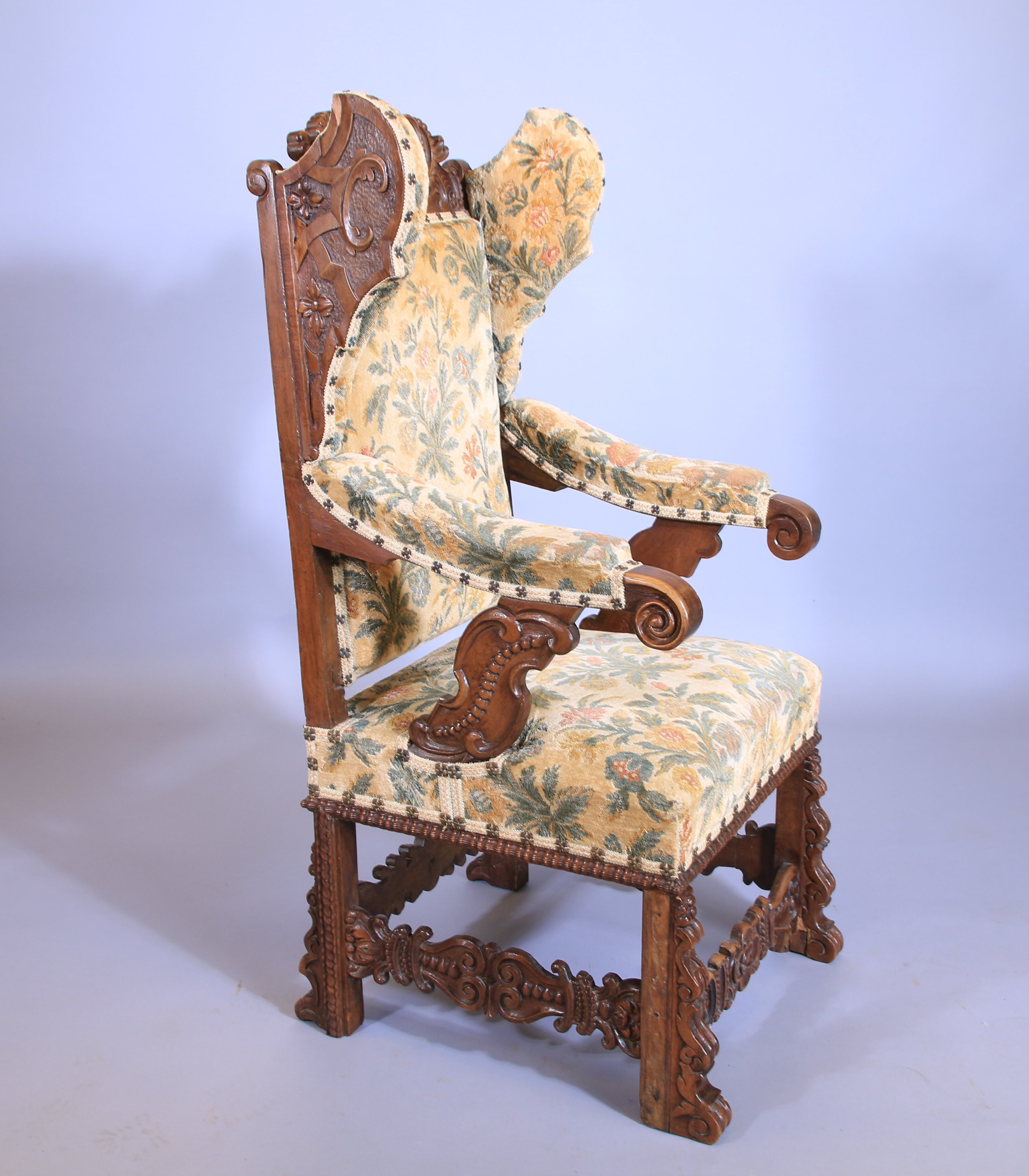 Sommet à décor d'une figure de chimère, accotoirs à manchettes terminés par des enroulements, pieds à décor de volutes, de végétaux et de perles, reliés par des barres d'entretoise richement décorés de volutes, frises de perles et fleurettes.