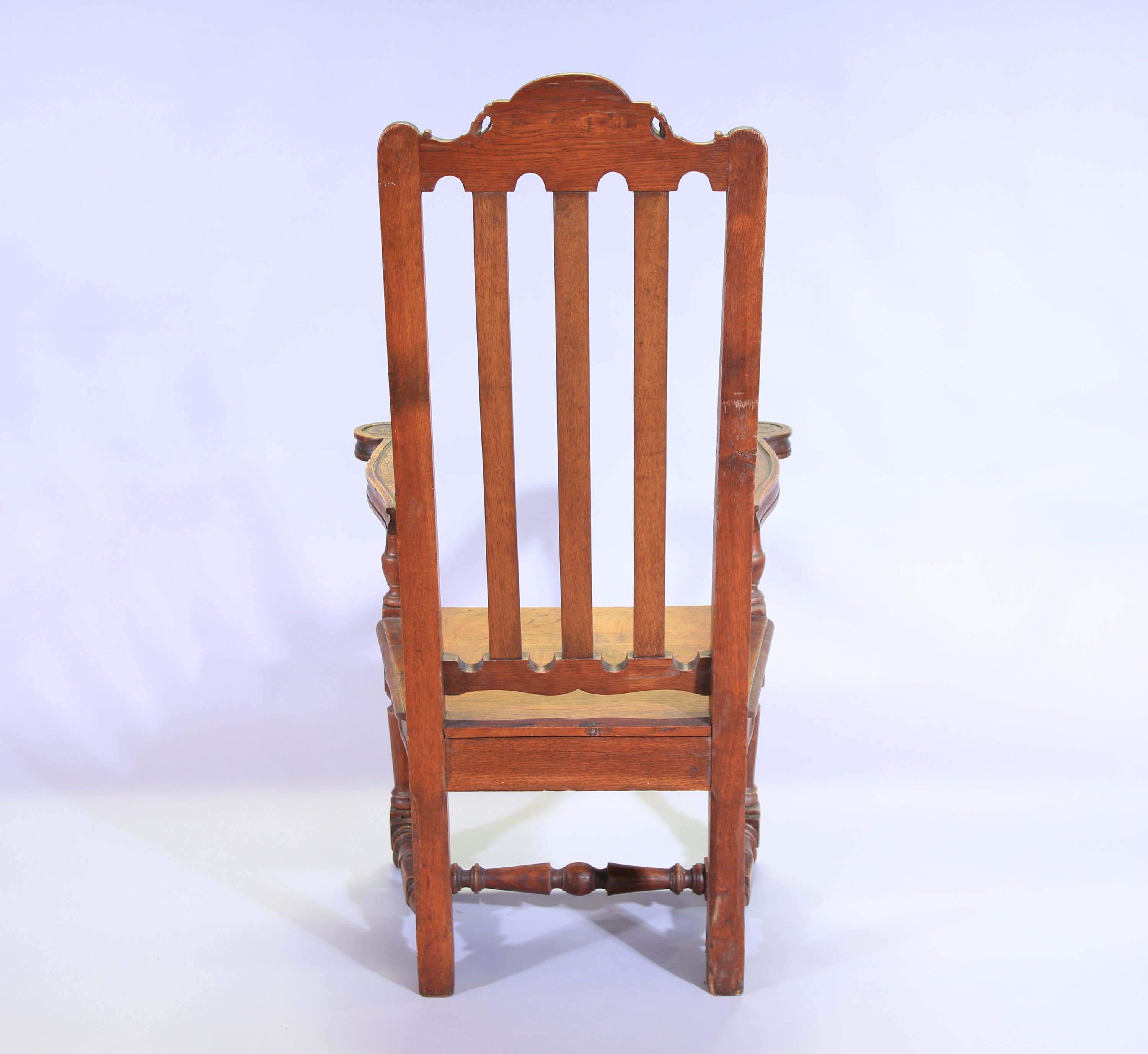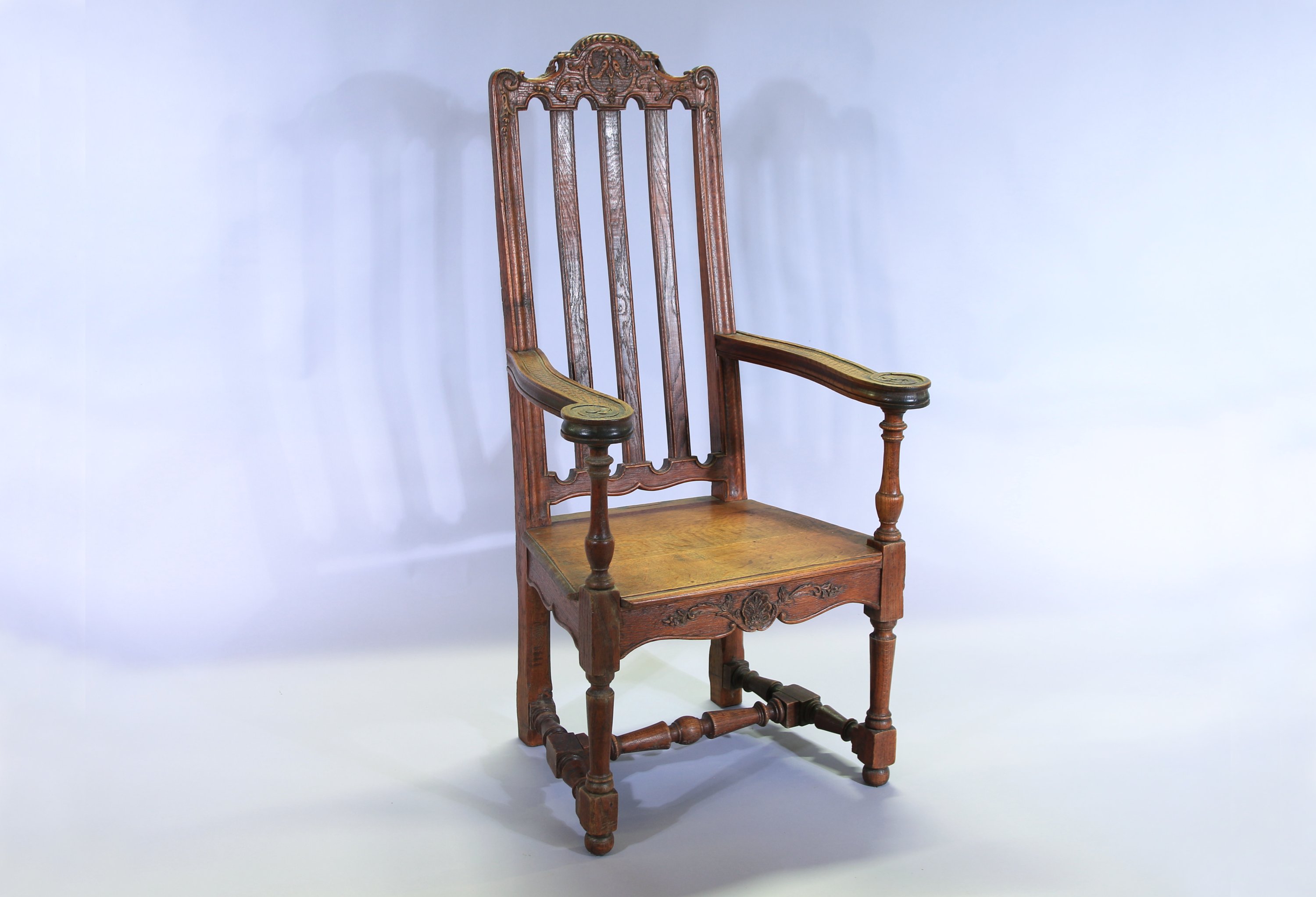 Chêne mouluré et sculpté, le dossier ajouré est décoré de frises et de motifs végétaux. Les accotoirs renversés finissent en volutes décorées en leur centre de fleurs. Assise trapezoïdale ornée en ceinture de motifs végétaux et floraux. L'ensemble repose sur deux pieds antérieurs de forme balustre et deux pieds arrières droits rejoints par une entretoise.