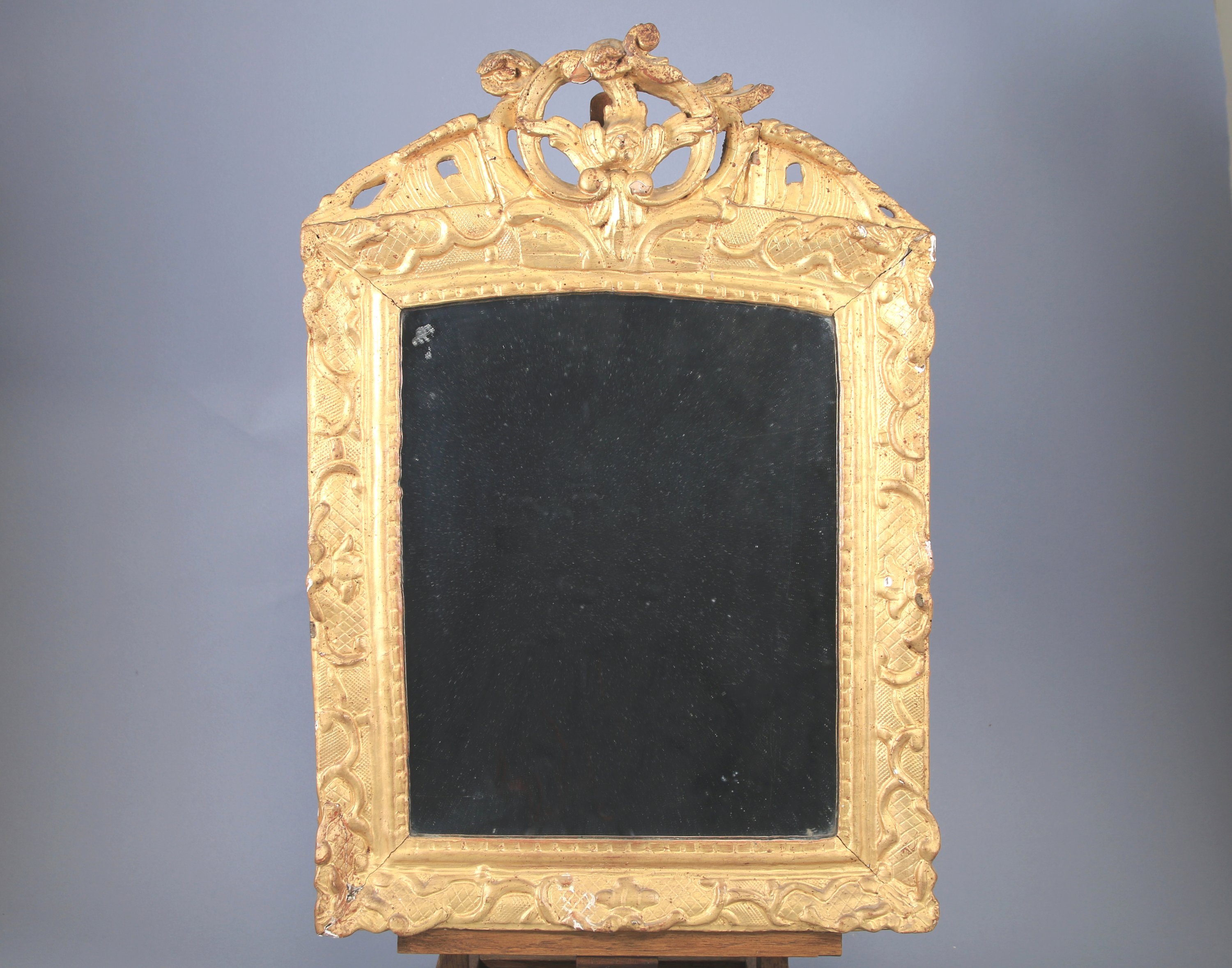 Bois sculpté et redoré. Le fronton à décor d’un bouquet dans des des rinceaux ajourés surmontant un cadre baguette "à la Berain".