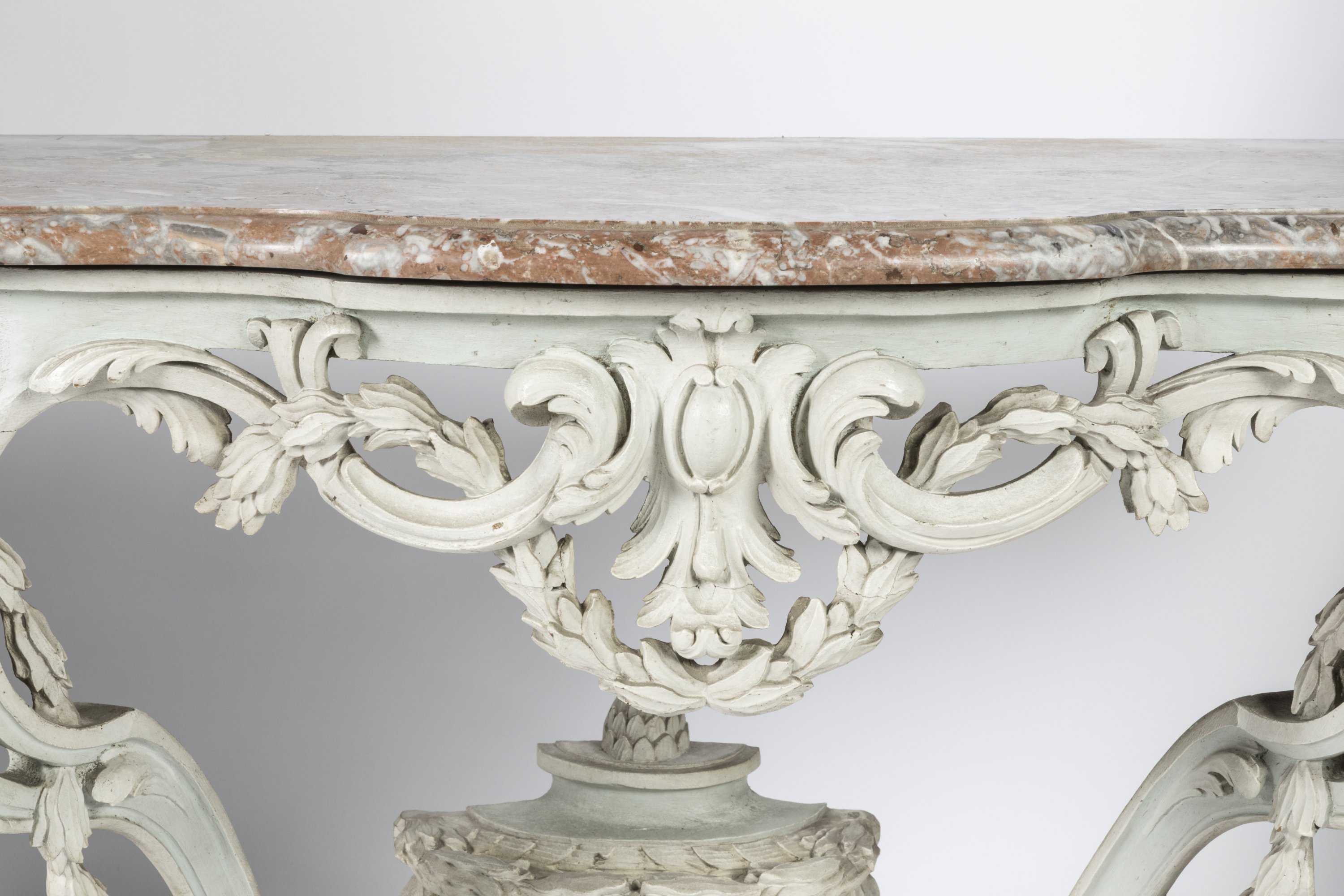Nos deux consoles formant fausse paire s'inscrivent dans la production du règne de Louis XV et notamment des dessins de l'architecte Pierre Contant d'Ivry. Les enroulements de guirlande sont à rapprocher d’un dessin pour une console de la Salle de Jeu du Palais Royal (in Bill Pallot, "L'art du siège au XVIIIe siècle en France", Paris, Gismondi, 1987, p. 156). Ce type de console à montants ajouré se retrouve parmi les plus importantes collections, à l’instar de celle du financier Jean Pâris de Montmartel comme en témoigne son portrait dessiné par Cochin fils (ibid., reproduit p. 256). Nicolas Heurtault livre quant à lui une console de lambris à Charles-Jean-Baptiste du Tillet vers 1758 pour le château de Villarceaux, où l’on observe « une puissante symétrie ».