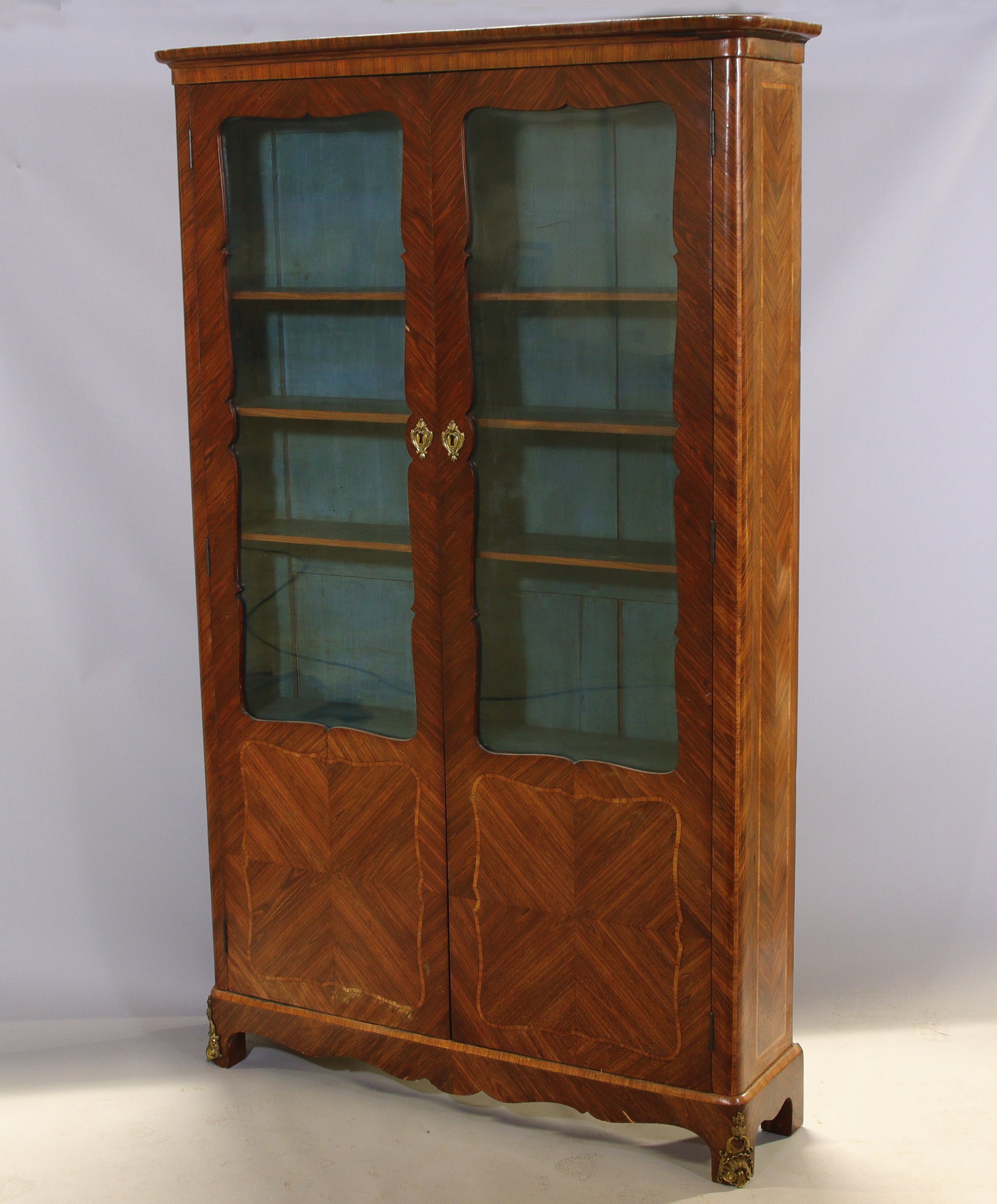 Coiffée d’une corniche et ouvrant par deux portes vitrées à entourage chantourné dont la partie inférieure est soulignée d’un filet. L’intérieur peint en bleu. Les côtés marquetés en chevrons, le tablier mouvementé. Quatre pieds.