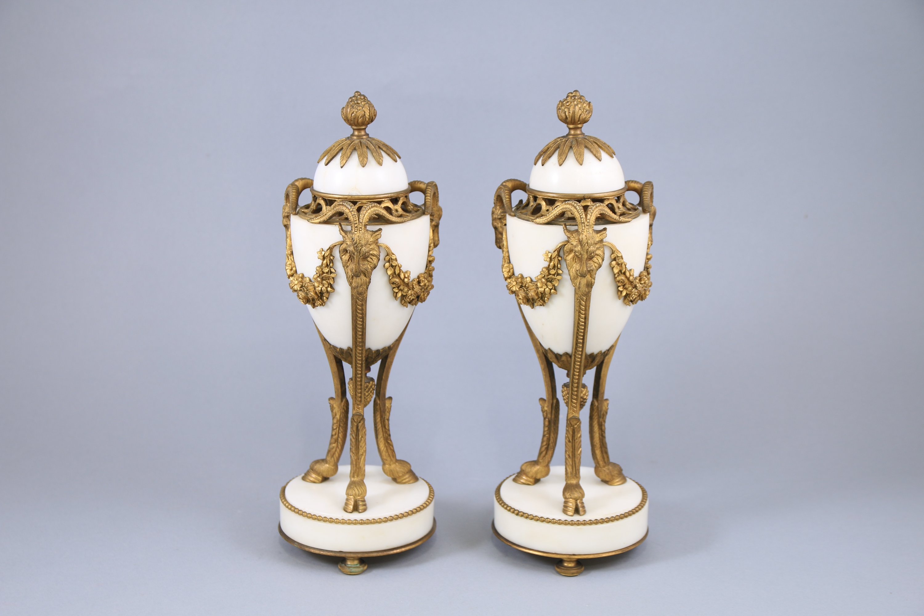 De forme ovoïde, elles présentent un fretel en grappe de raisin prolongé par des palmes. Le piètement tripode terminé par des sabots est orné de têtes de béliers reliées par des guirlandes de fleurs. La base décorée d'une frise de perles repose sur trois pieds patins.