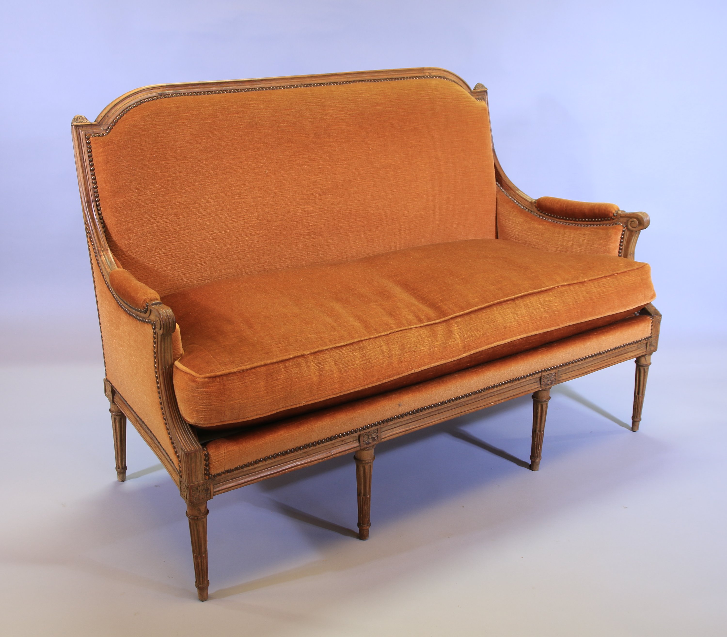 Dossier en chapeau de gendarme, accoudoirs à manchettes terminés par des enroulements, montants cannelés et rudentés. Ils reposent sur huit pieds fuselés, cannelés et rudentés, fleurettes aux dés de raccordement.