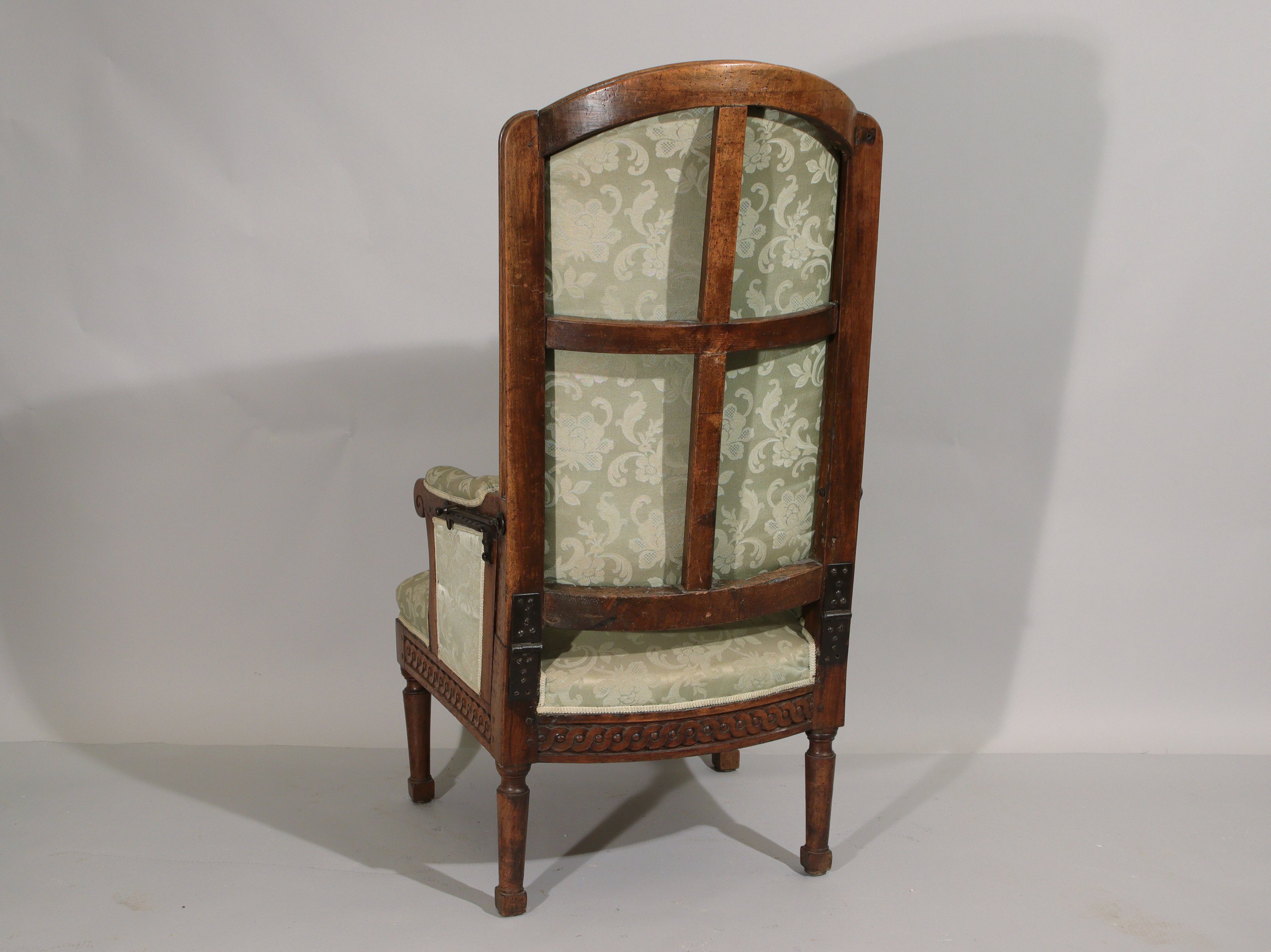 Haut dossier inclinable. Les accotoirs à manchettes en retrait terminés par des volutes. La ceinture à décor de piastres. Il repose sur quatre pieds fuselés terminés par des sections carrées. Le mécanisme en fer, sur le côté de l'assise, permet huit positions d'inclinaison.