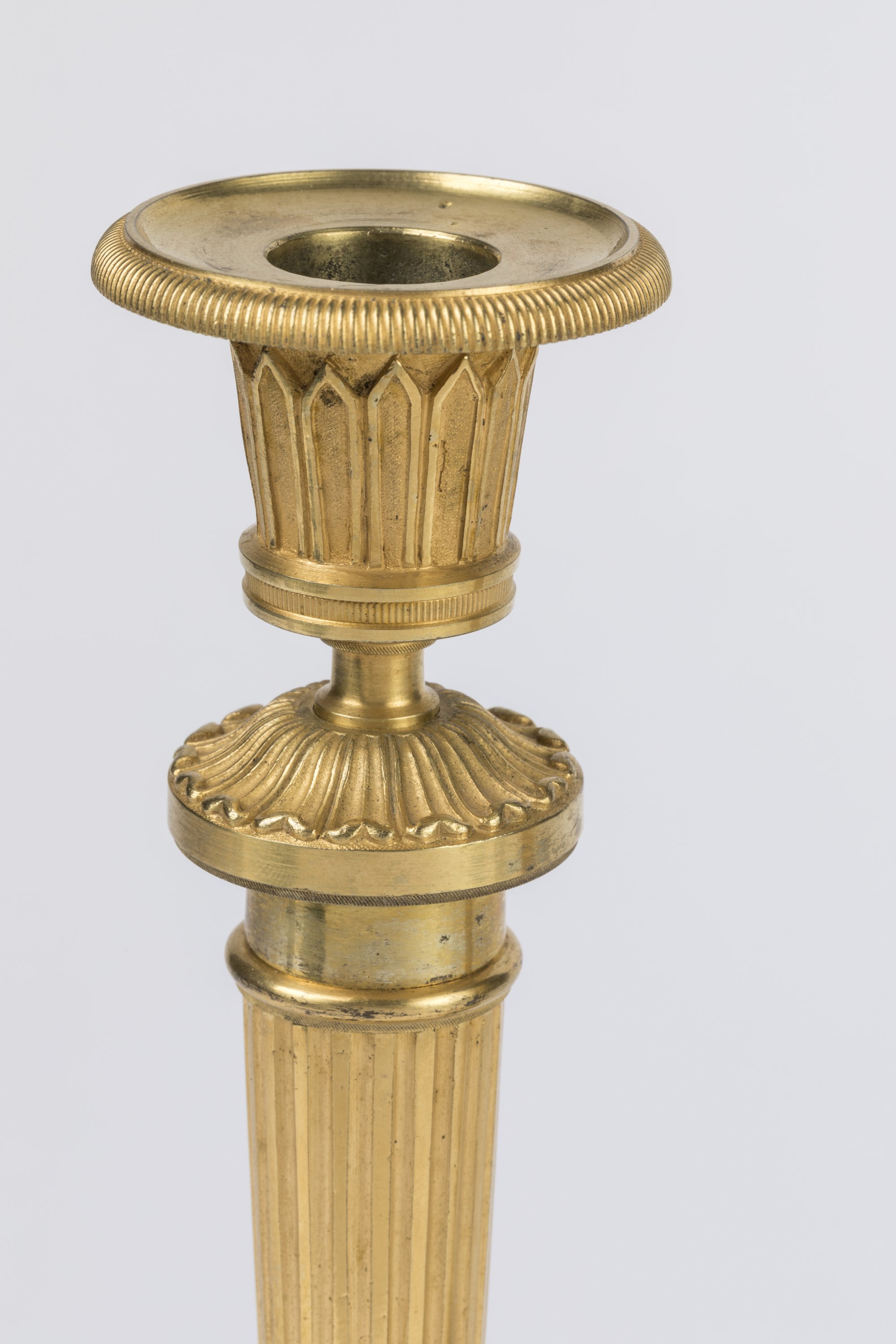 Le fût tronconique cannelé et répertoire décoratif de feuillage réniforme pour la base.