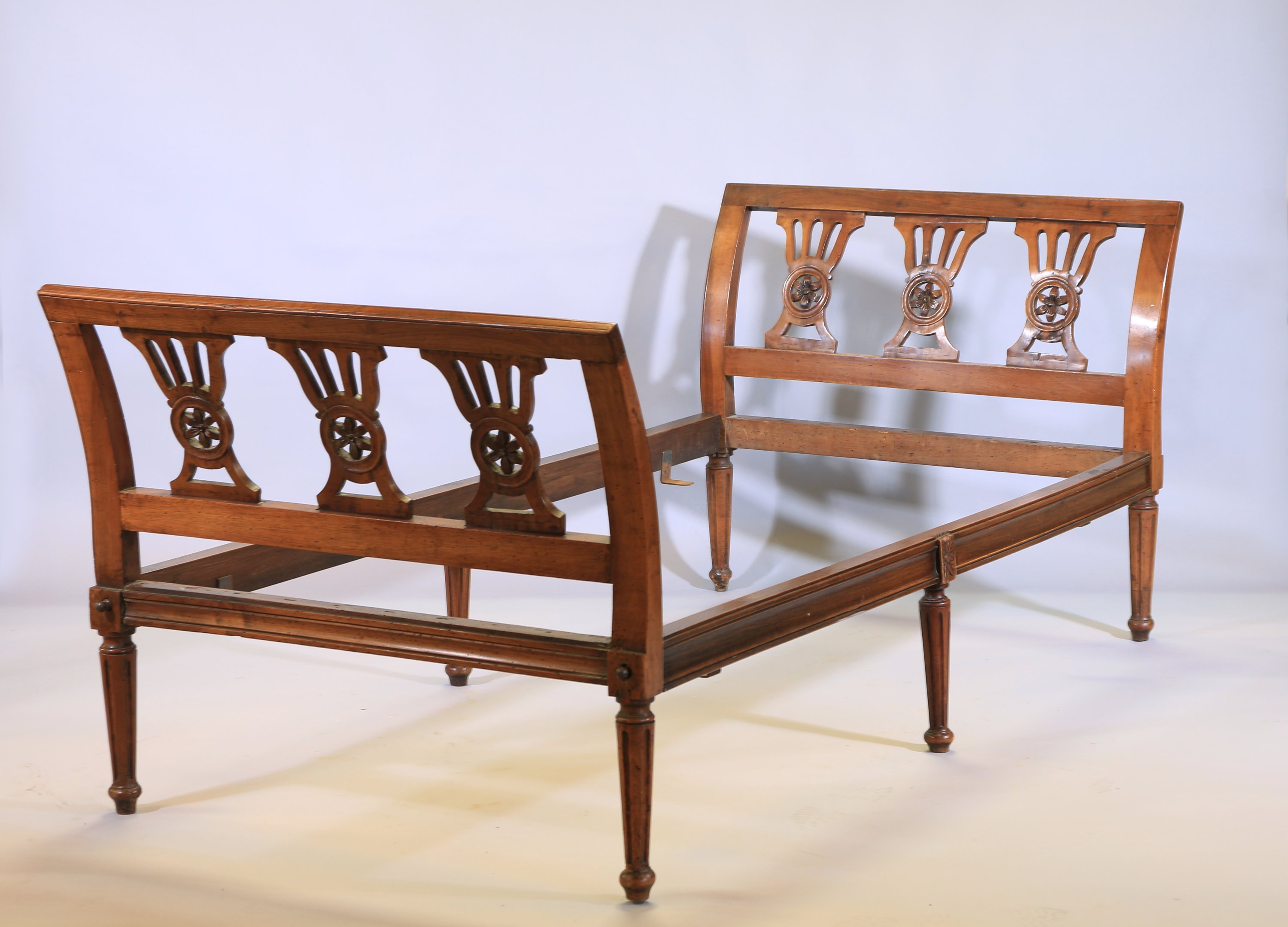 Les montants renversés sont ajourés de motifs de fleurs et de mongolfières. Ils reposes sur six pieds fuselés et cannelés, fleurettes aux dés de raccordement.