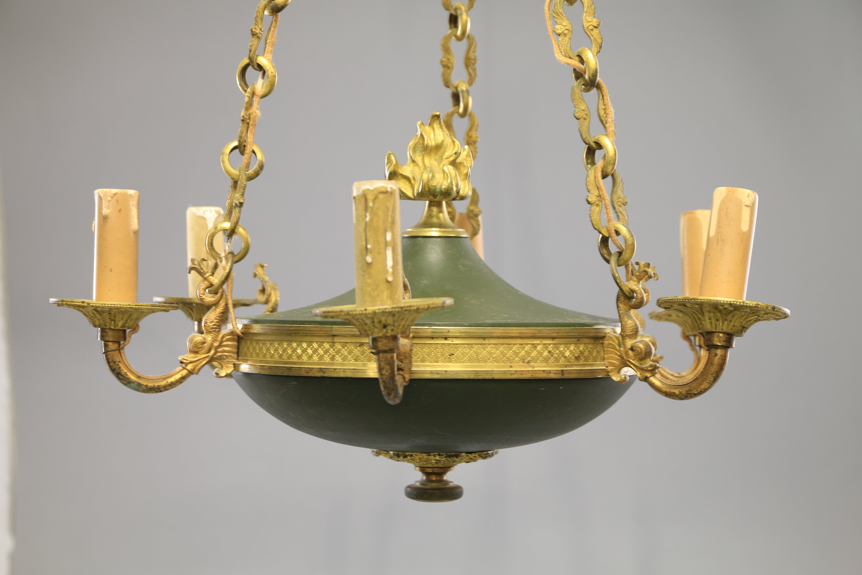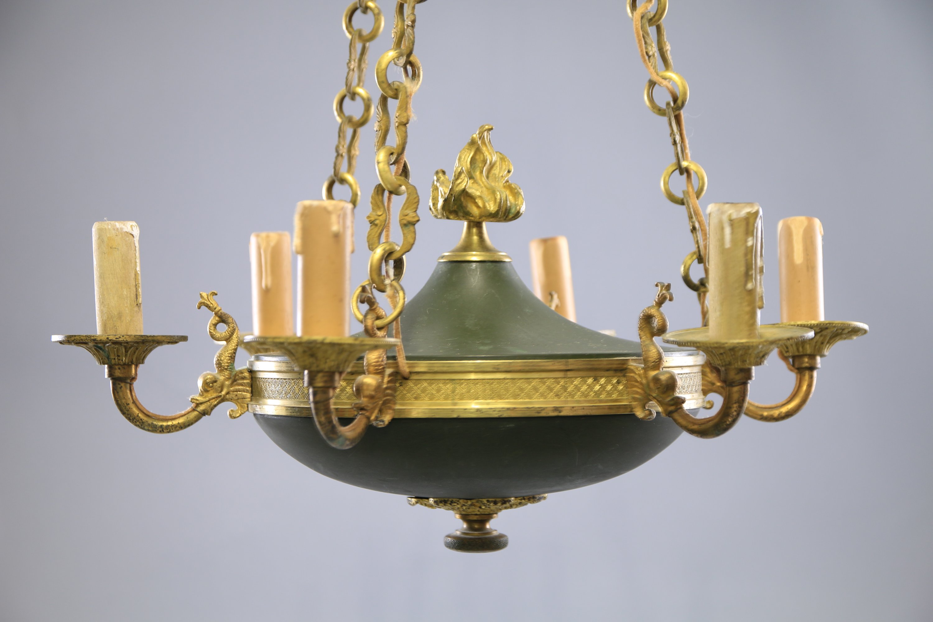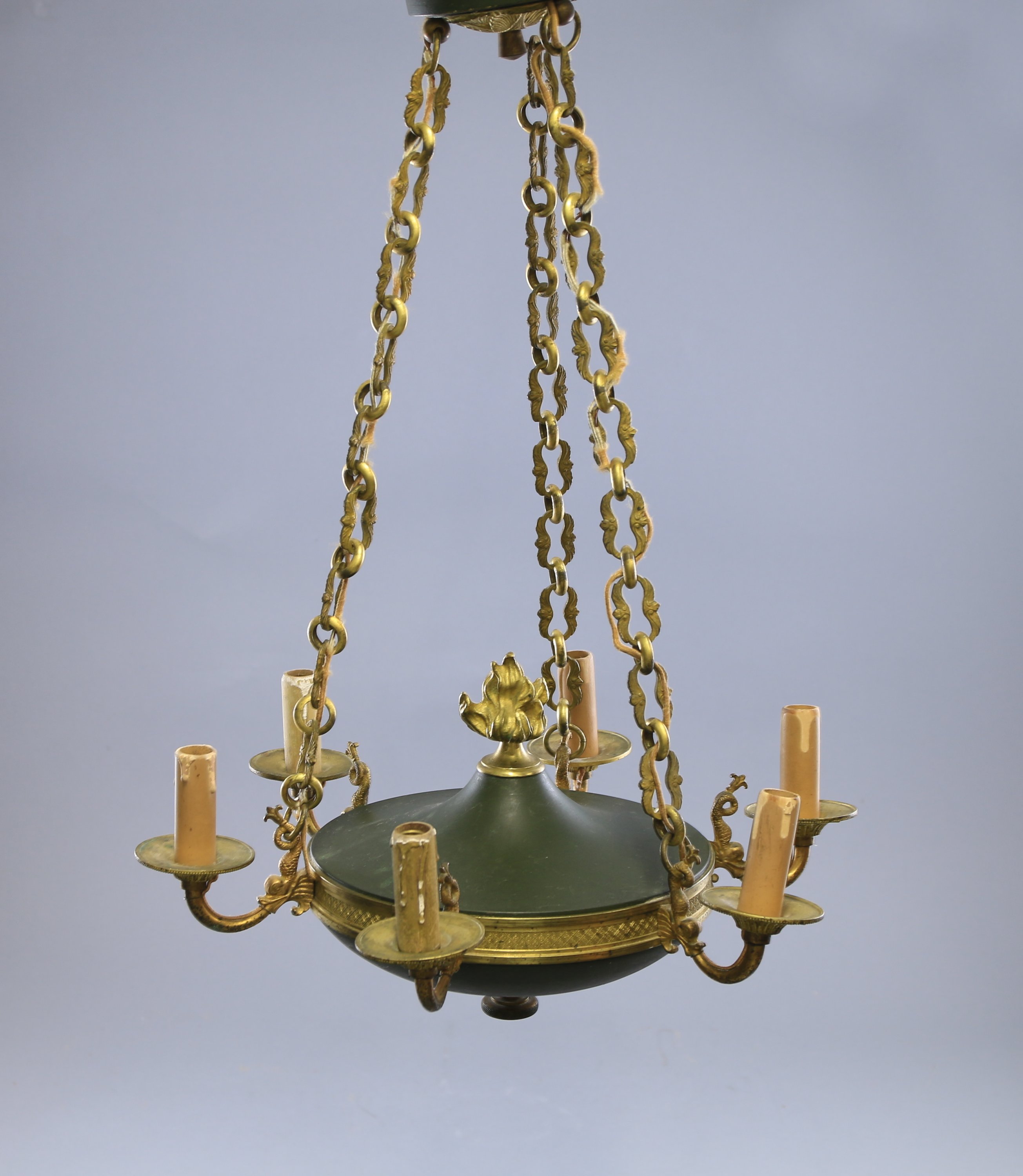 Six lumières. La petite couronne à décor d'une terrasse de feuillages, un feu en partie centrale.