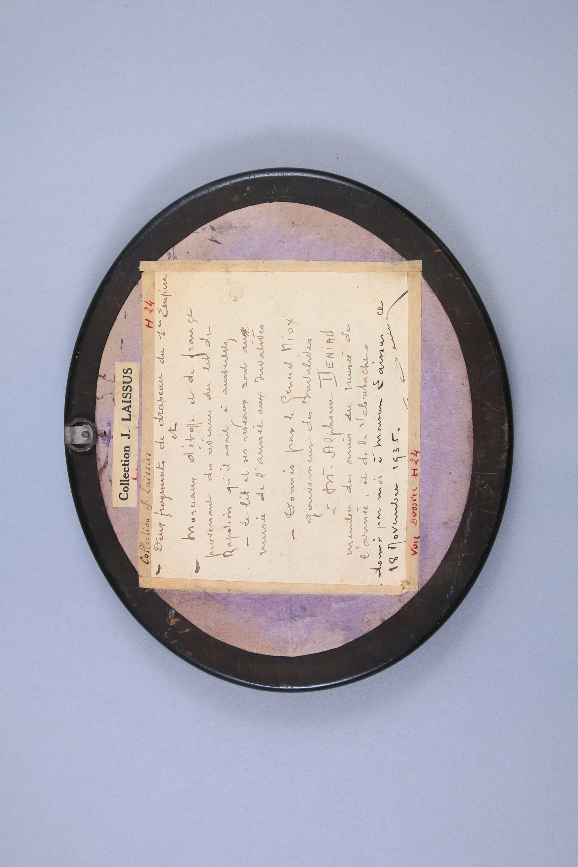 Etiquette au dos avec les mentions manuscrites par Alphonse Deniaud: "Deux fragments de drapeau du 1er Empire et morceaux d'étoffe et de frange provenant des rideaux du lit de Napoléon qu'il avait à Austerlitz. Le lit et ses rideaux sont au Musée de l'Armée aux Invalides. Donné par le Général Miox gouverneur des Invalides à Monsieur Alphonse Deniau membre des amis du musée de l'armée et de la Sabretache. Donné par moi à Monsieur Laissus ce 18 novembre 1935".