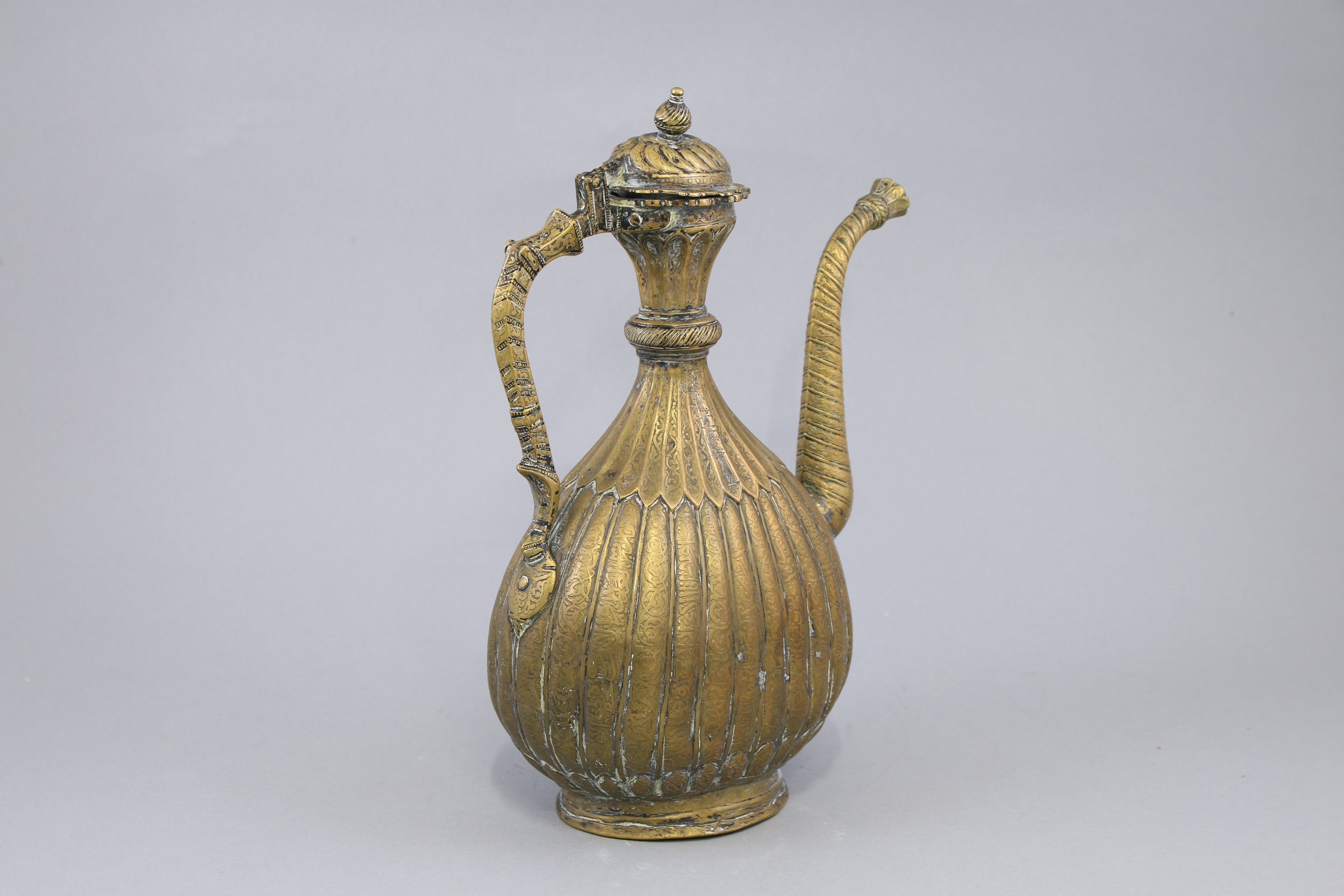 A décor de godrons rehaussés de calligraphies et de rinceaux, bec et anse torsadés, le fretel en forme de coupole bulbeuse.