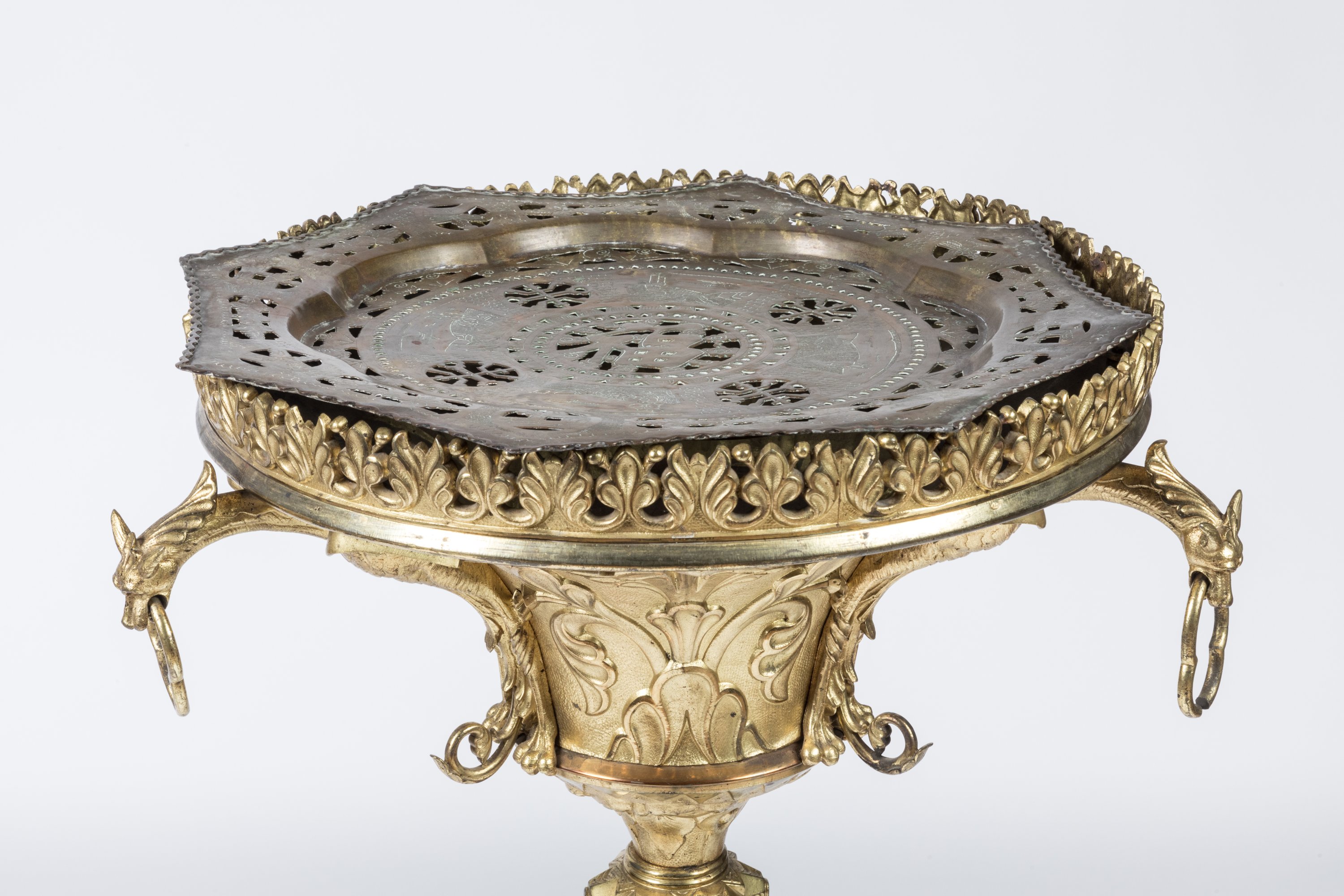France, Second Empire. A pair of ormolu stands decorated with fabulous beasts and topped with oriental-style pierced vases.