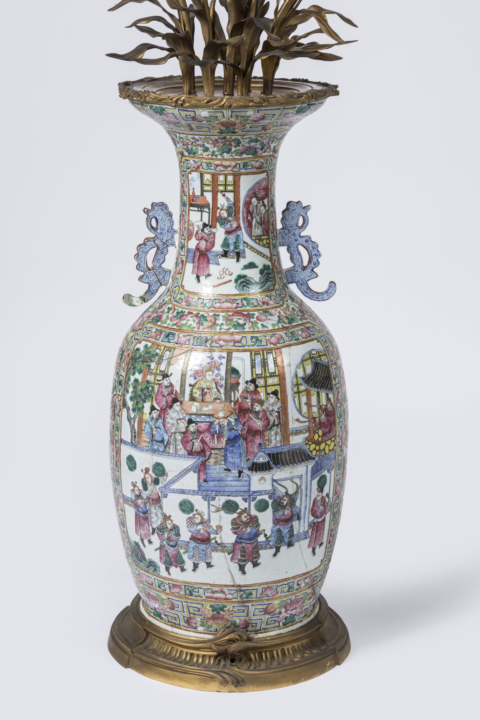 De forme balustre à décor émaillé de scènes de palais. La monture en bronze doré sous la base et à la lèvre retient en partie supérieure huit branches fleuries en bronze doré terminées par des fleurs de lys formant flambeaux.