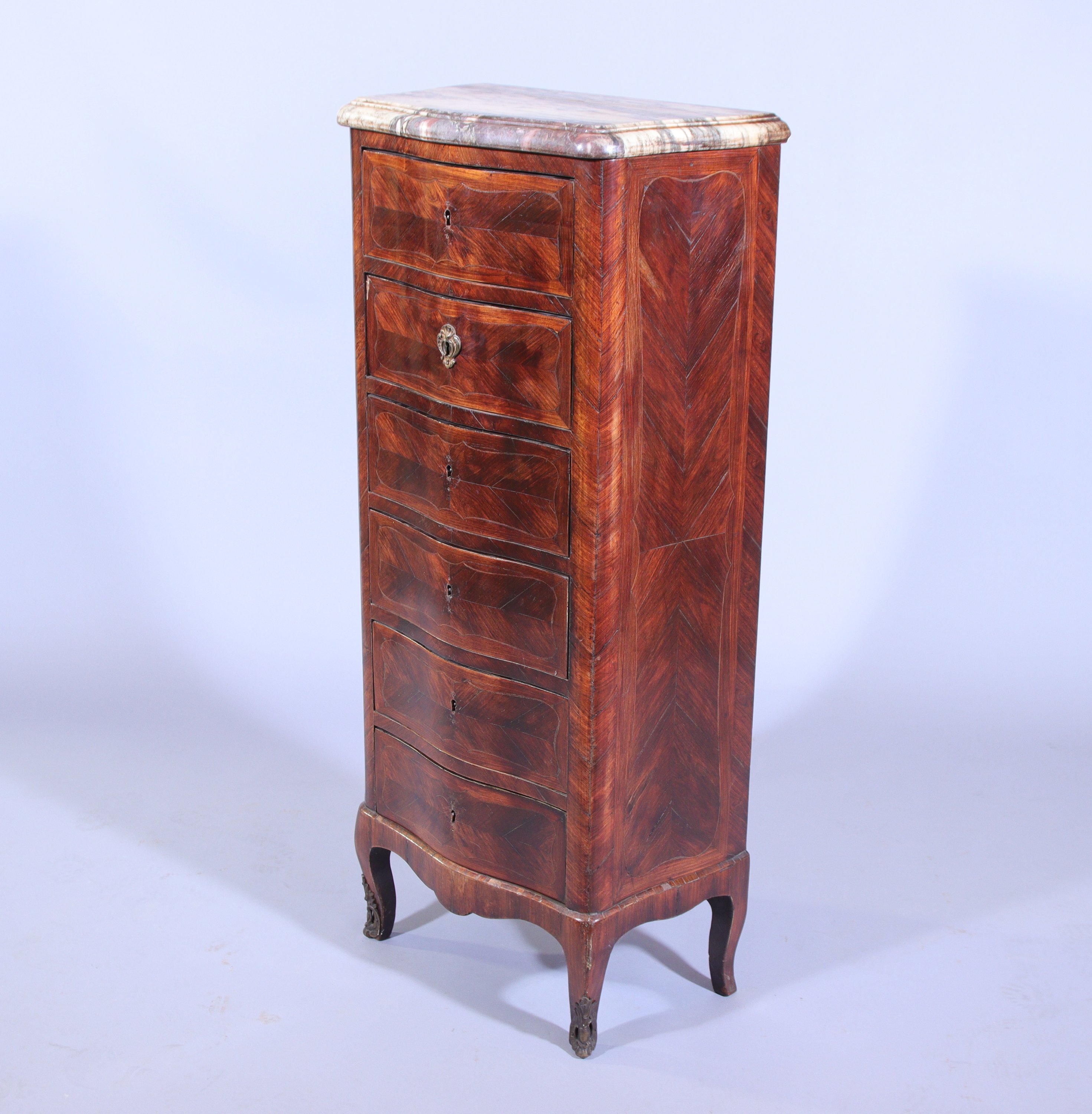 A façade galbée ouvrant par six tiroirs en façade décorés de réserves en ailes de papillon. Il repose sur quatre pieds cambrés.
