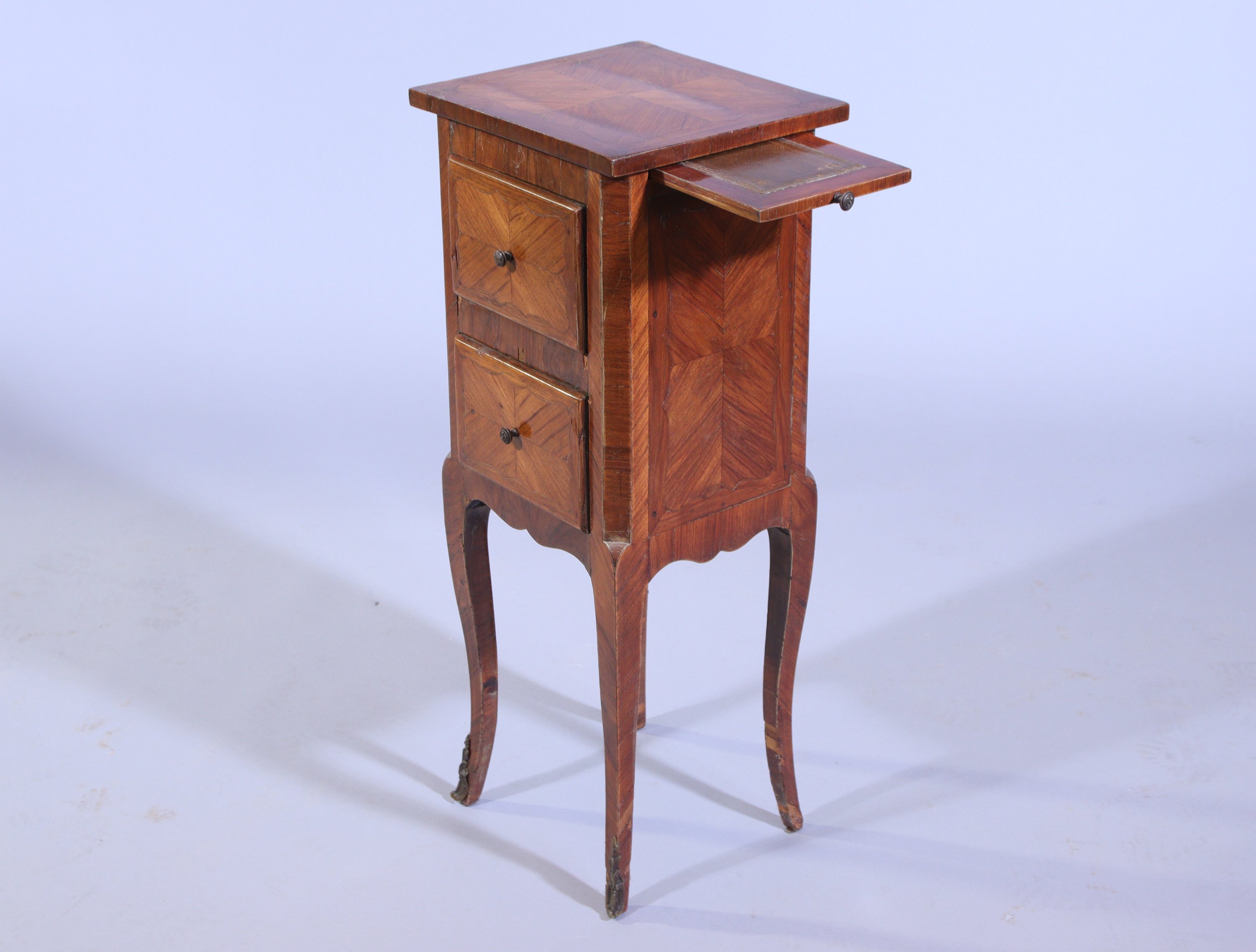 Jointe: Jolie table volante en placage de bois de rose. Le plateau carré surmontant deux tiroirs séparés par une traverse. Un côté présentant une tablette gainée d’un cuir. Quatre pieds cambrés. Style Louis XV de qualité. Haut. 70,5 Larg. 27 Prof. 25 cm. (sauts de placage)