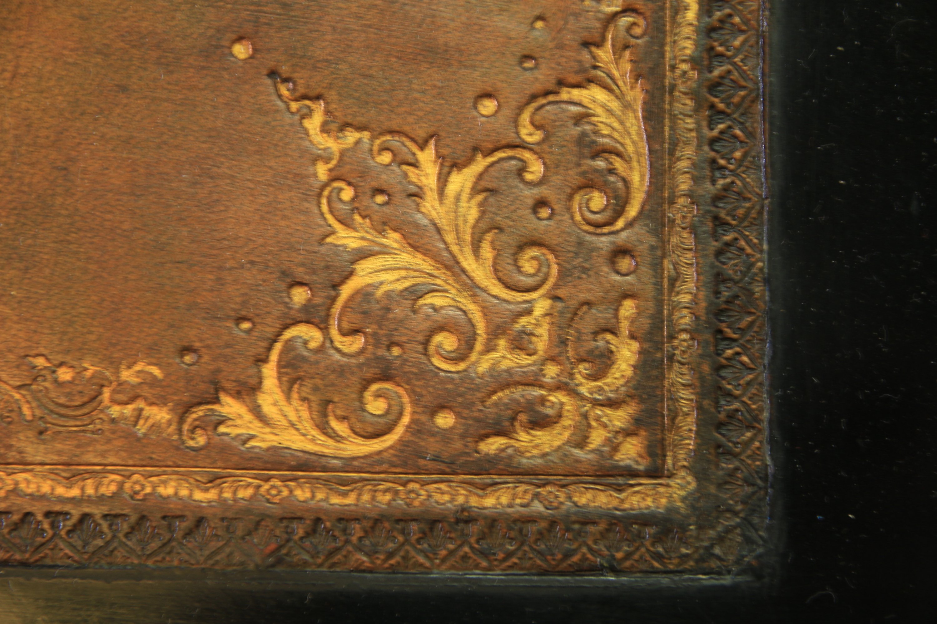 Il ouvre par trois tiroirs en ceinture. Plateau ceint d'une lingotière et foncé d'un cuir havane doré au petits fers de motifs d'acanthes et de rinceaux, trois tiroirs simulés en façade. Il repose sur quatre pieds cambrés.