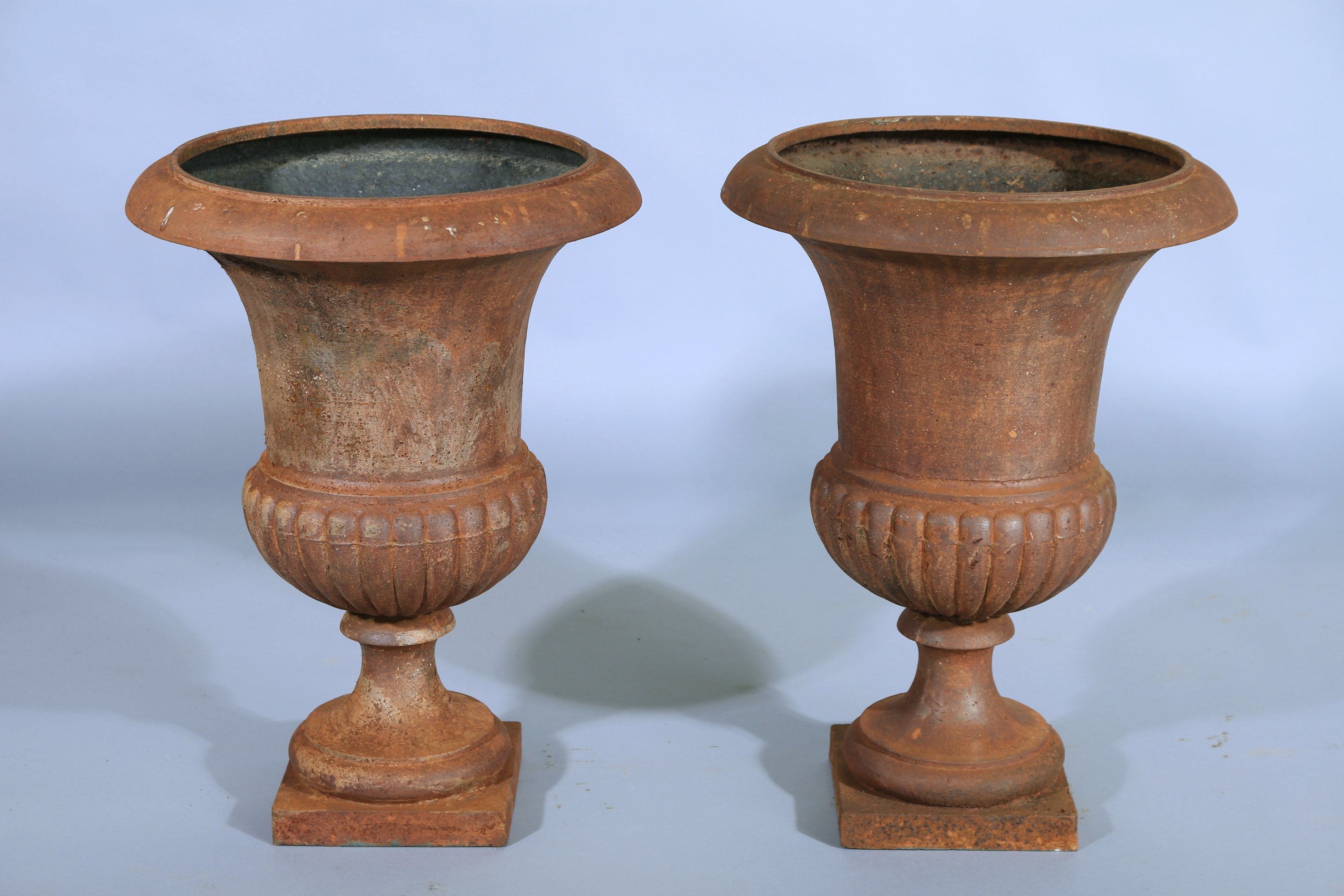 Joint: vase médicis en fonte laquée blanche, lèvre à décor d'une frise d'oves et panses à décor de godrons. Il repose sur un piédouche fixé sur une base carrée. Haut. 65 Larg . 50 cm. (oxydations et piqûres)