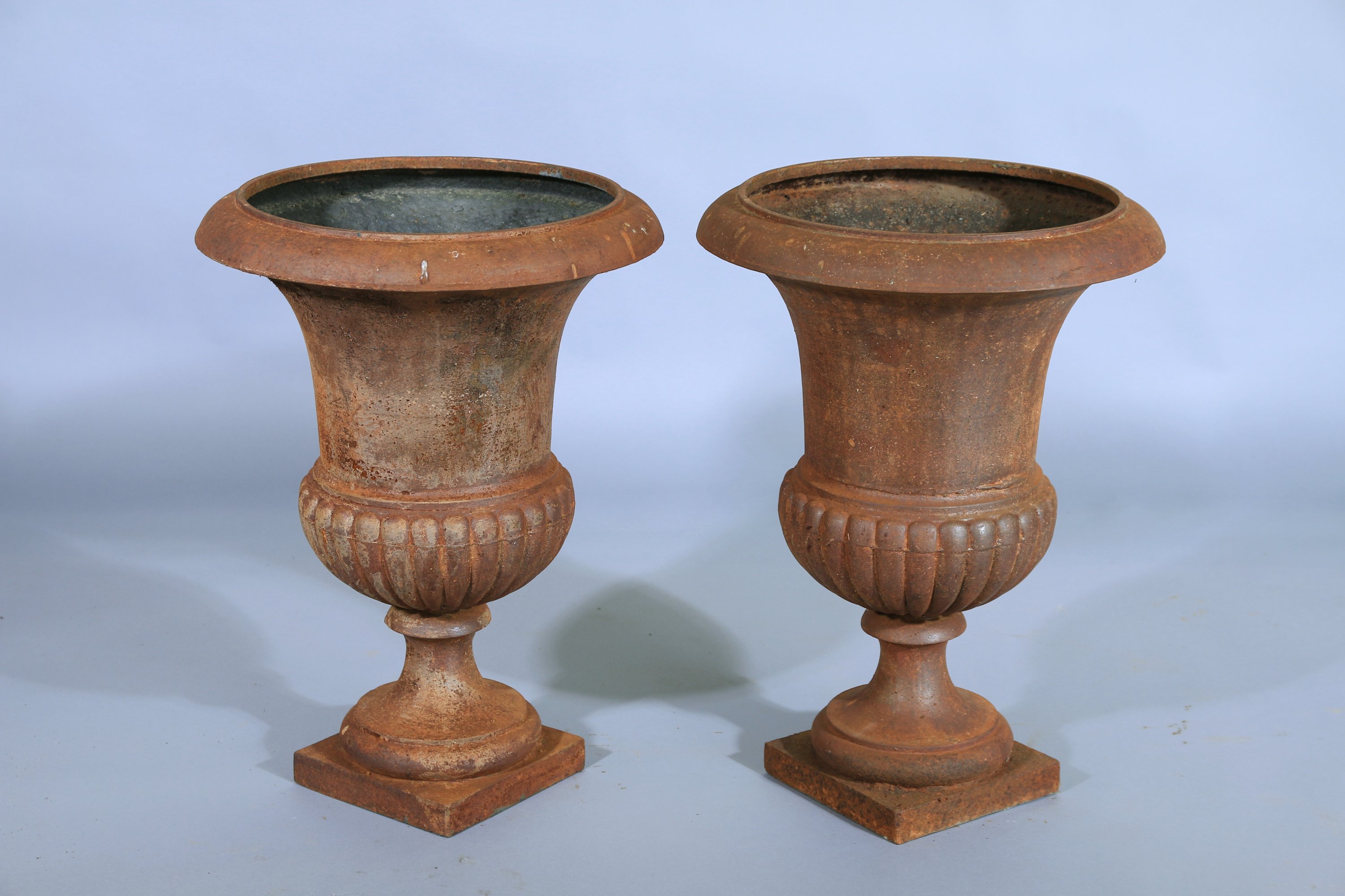 A lèvres évasées et panses à décor de godrons, ils reposent sur des piédouche montés sur des socles carrés.