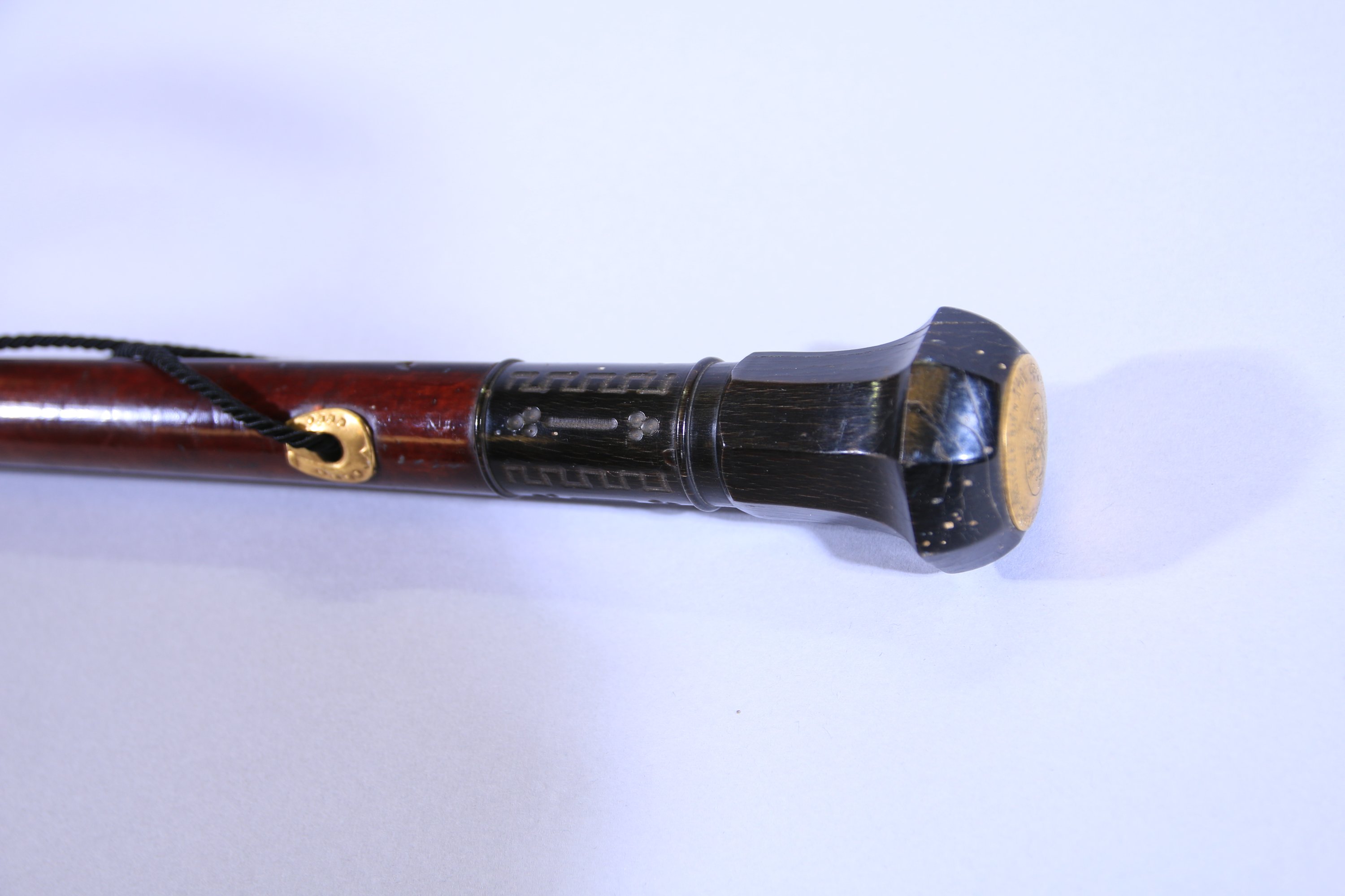 Pommeau octogonal en corne orné d'une pastille en laiton inscrite " E.R. Angoumois le Bien Aimé / R.A. Nantes St Eloi d'été 1897" ainsi que les lettres "G.A.D.H.A.C / D.D.E.D.M.J". férule en laiton dévissable à décor de symboles initiatiques portant une inscription "Lyon 1893 déposé /645".