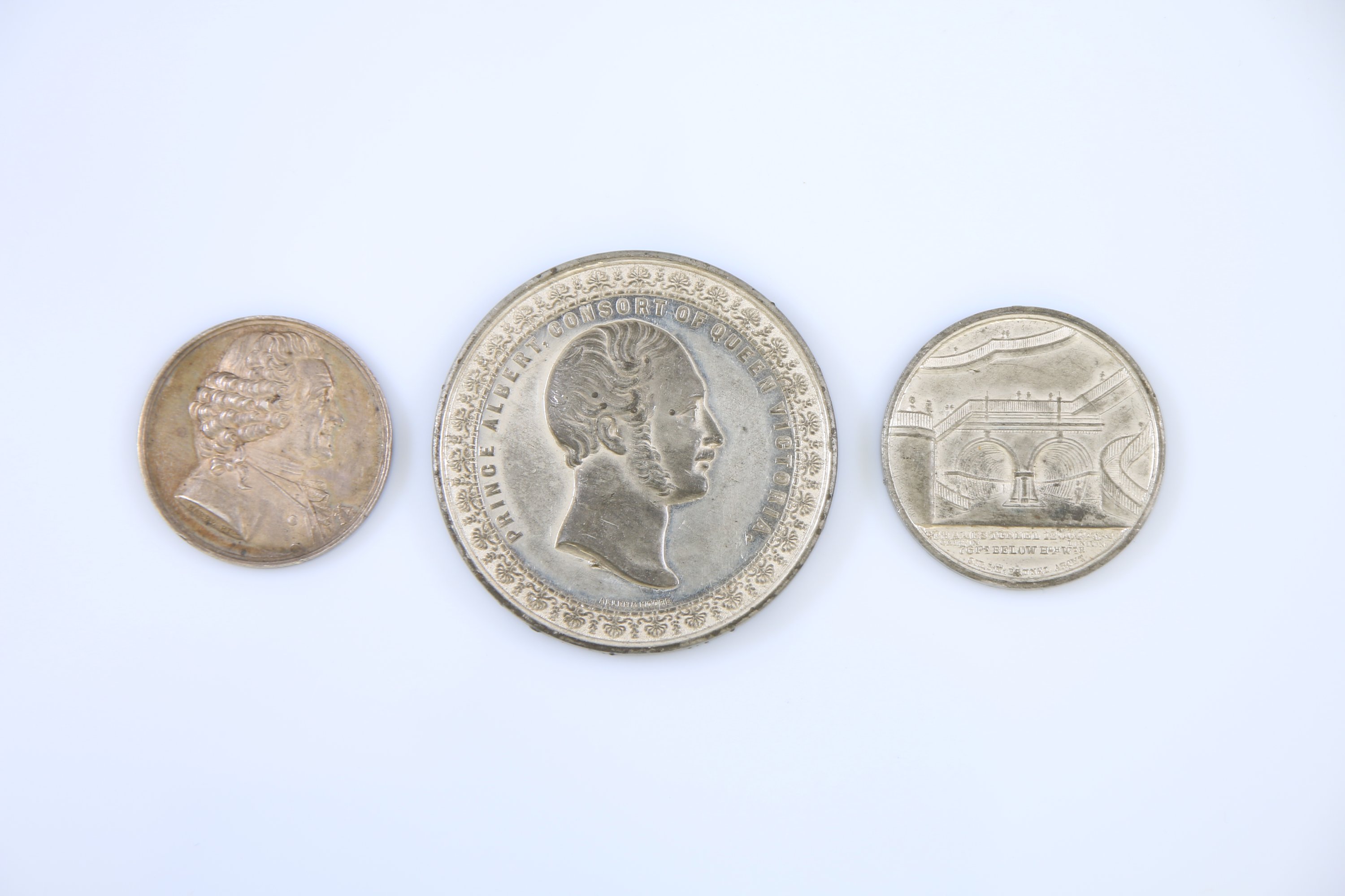 - Médaille commémorative en étain de l'ouverture de la Tamise en 1843 montrant les deux entrées du tunnel avec de légères variantes entre l'avers et le revers. Diam.: 51 mm.