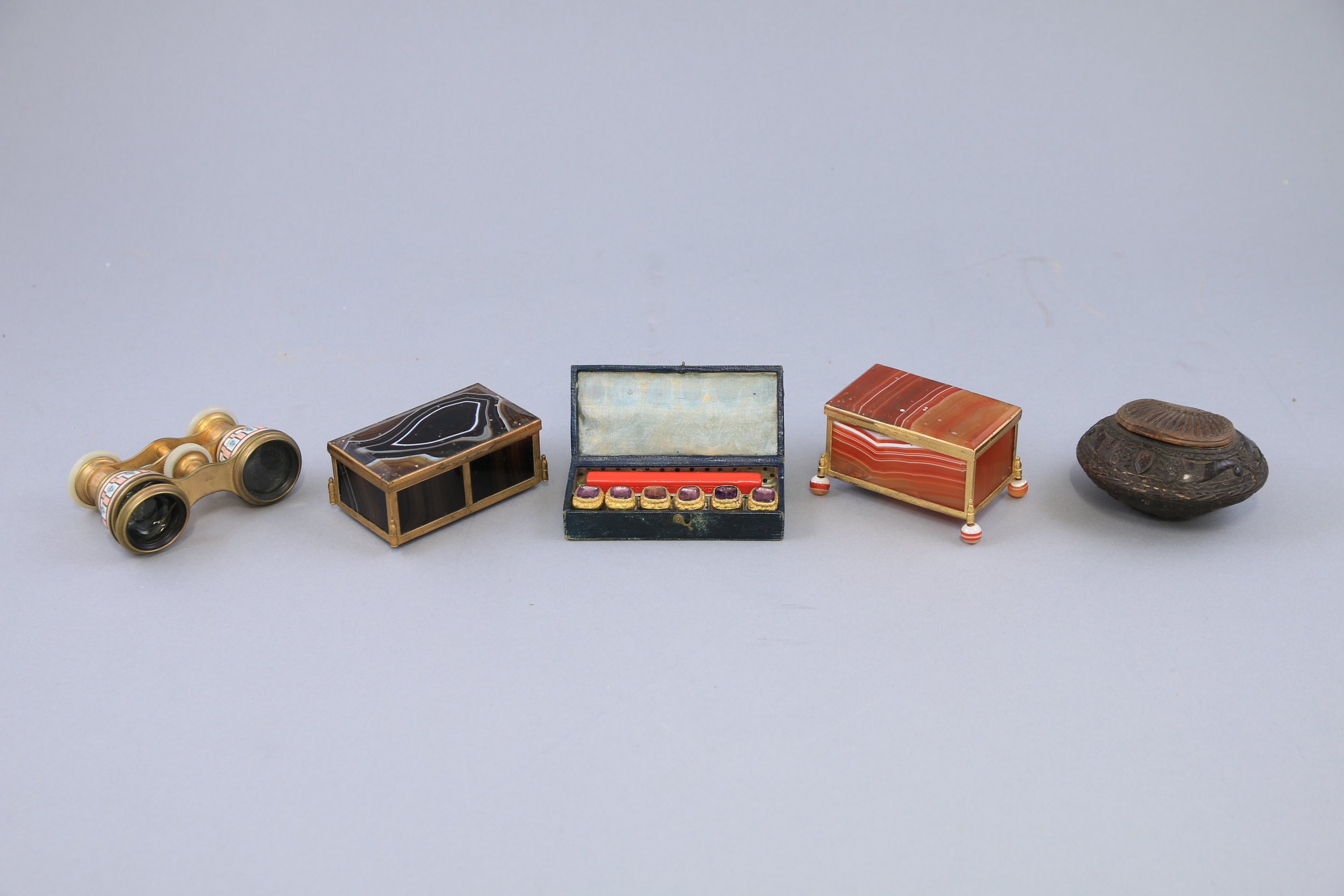 - Deux boites en agate et bronze doré, l'une à deux compartiments pouvant former boite à parfum.