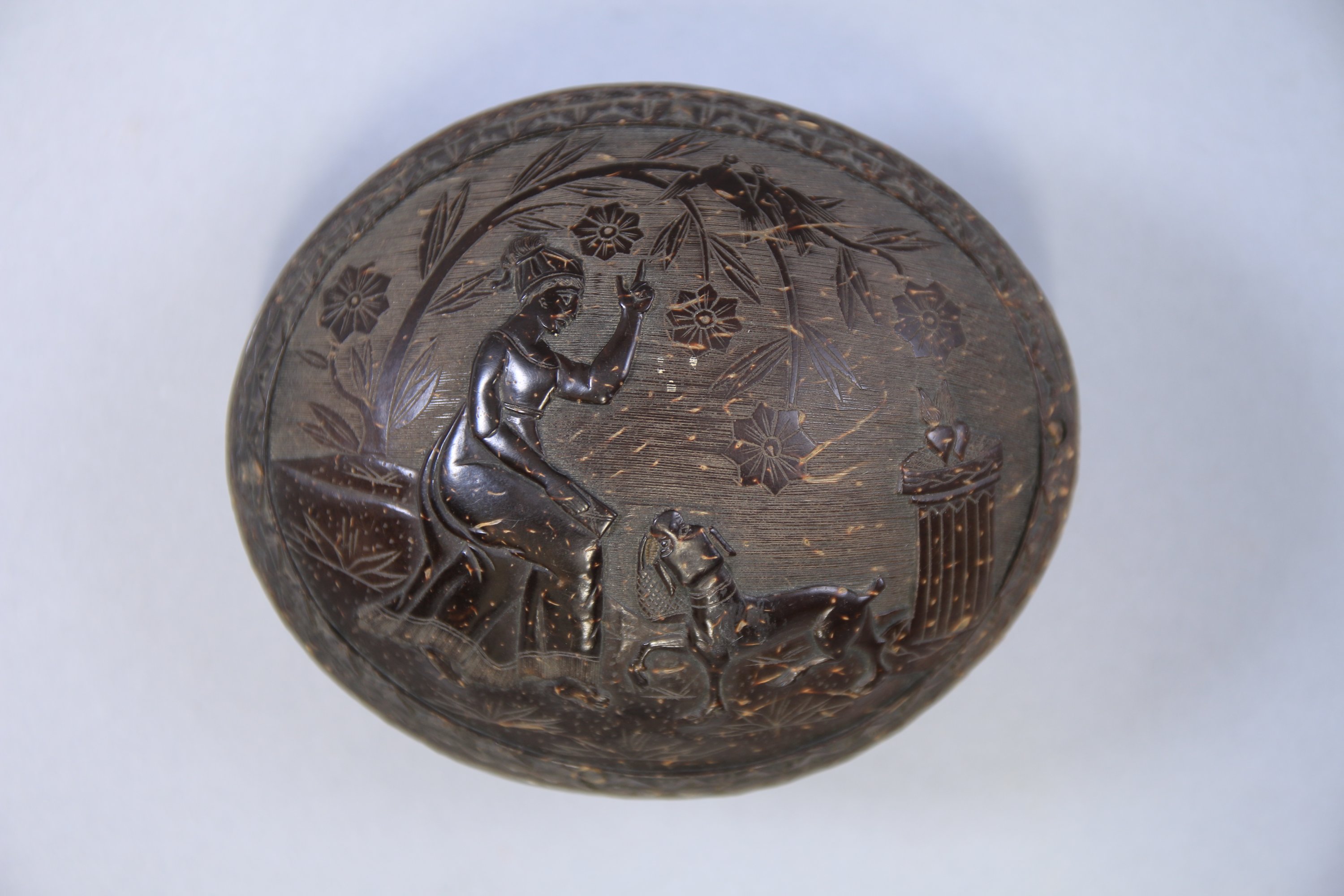 - Petite boite en noix de coco sculptée à décor d'une scène à l'antique d'une femme et de son chien dans un jardin et de cornes d'abondance, couvercle sculpté en forme de coquille.