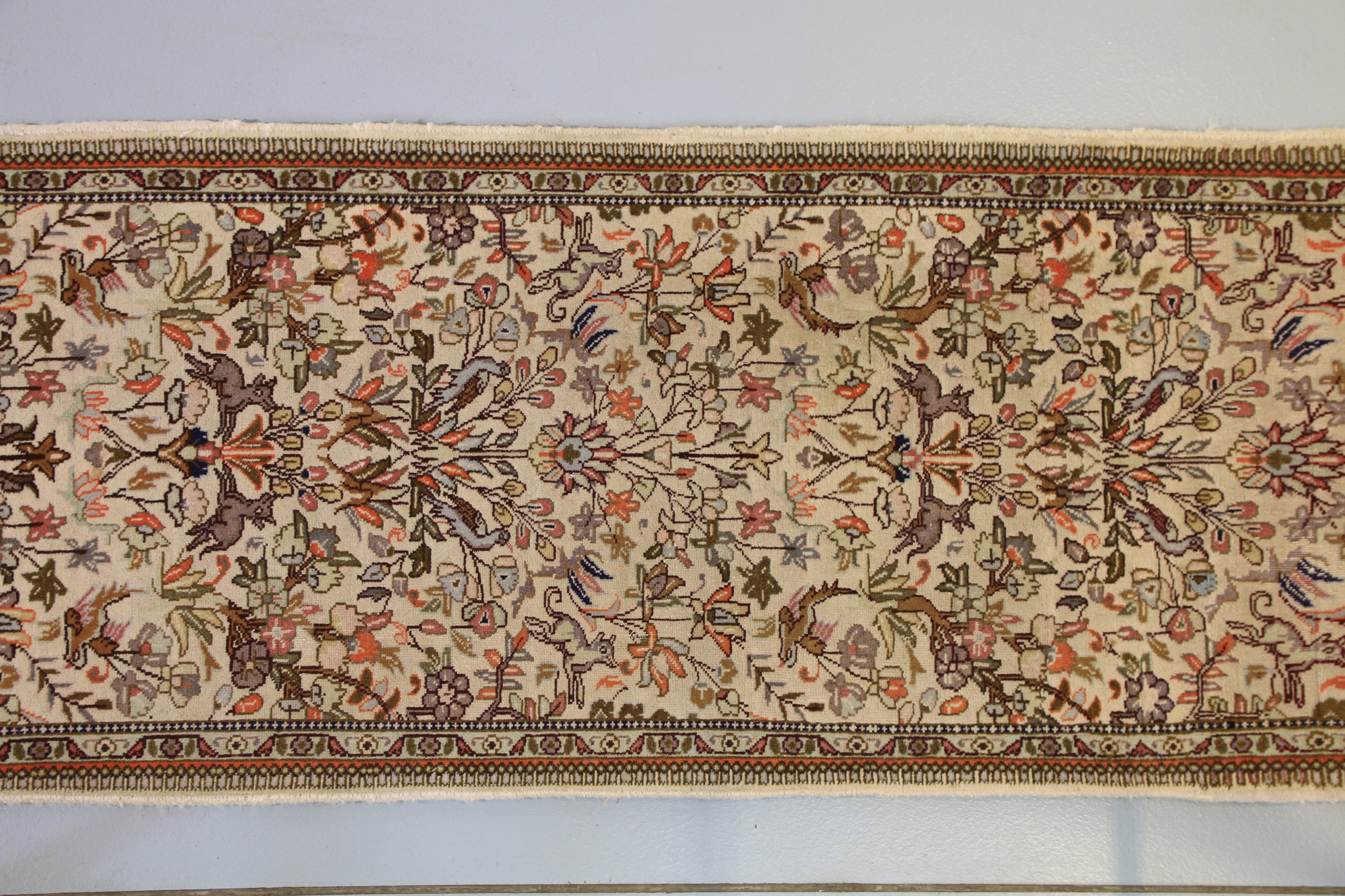 Fond crème, décor paradisiaque de tiges fleuries et animaux, bordure d’un galon turquoise.