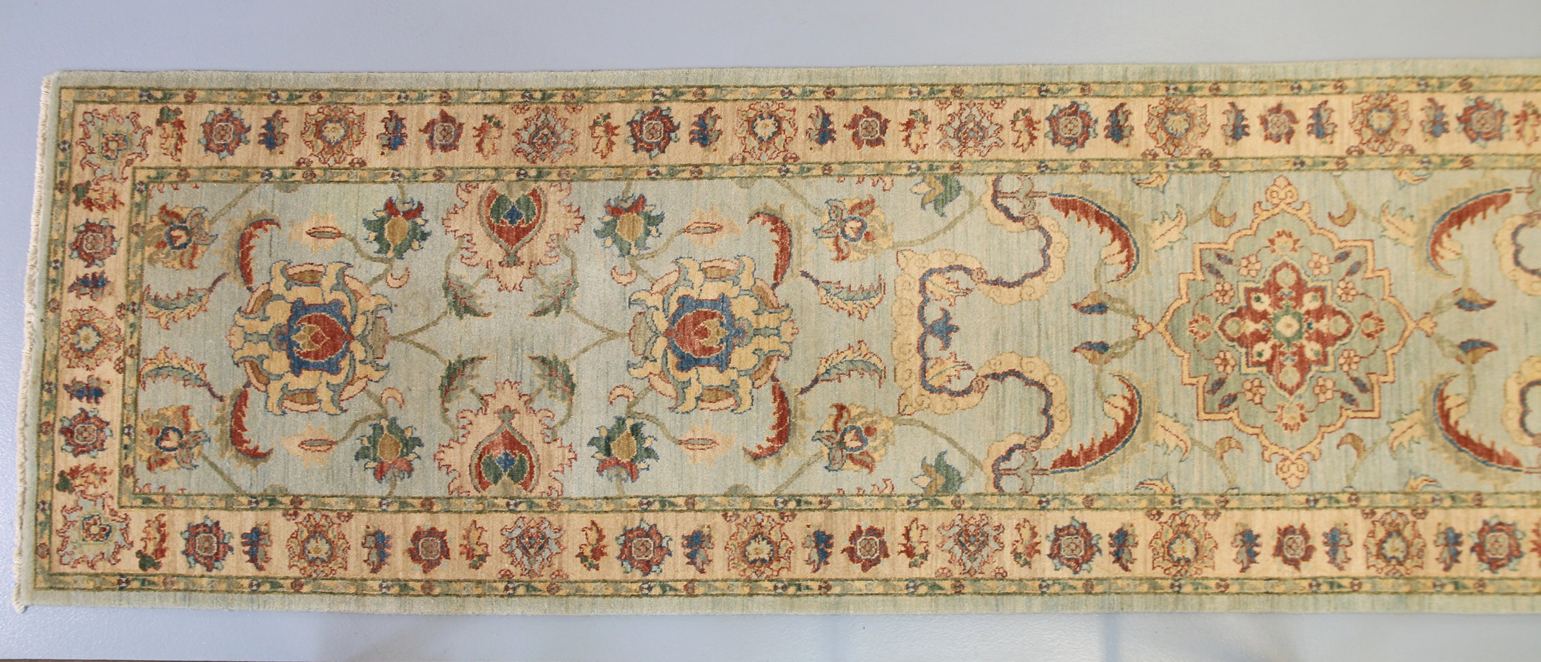 Fond turquoise, décor de fleurs shah Abbas, bordure crème de fleurs.
