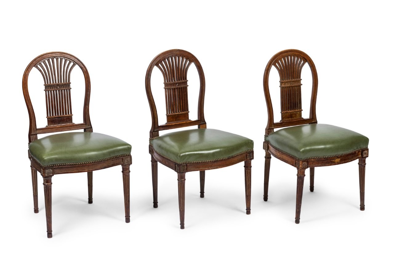 A set of nine "hot-air balloon" walnut chairs. Late 18th century-early 19th century. Green leather upoholstery and brass nails.