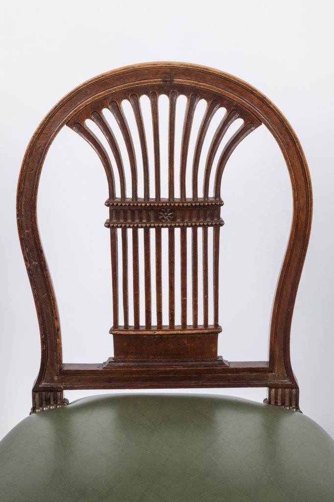 Cette série de chaises reprend toutes les caractéristiques des derniers feux du style Louis XVI, avec ces dossiers qui évoquent le vol des frères Montgolfier le 19 septembre 1783 dans la cour de Versailles en présence du roi, féru de science et de technologie. Ce modèle connut un succès particulièrement durable entre le Consulat et la Monarchie de Juillet, comme en témoigne la chaise conservée à Fontainebleau, provenant à l’origine de la collection du général Moreau.