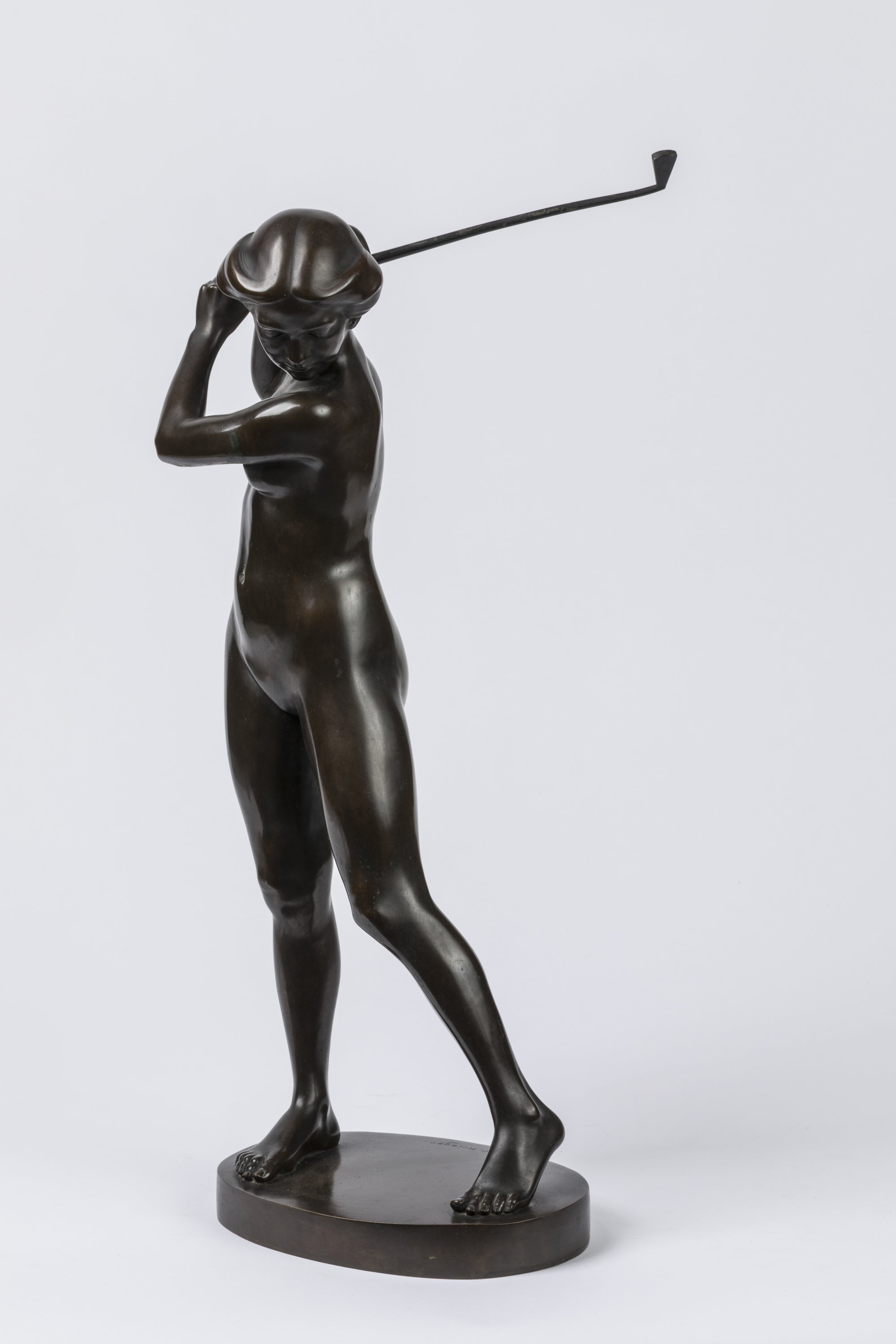 Sculpteur autodidacte, Krieger intègre à partir de 1907 la Sécession munichoise. Il est connu pour ses bronzes animaliers, notamment d'oiseaux, et sa collaboration avec la manufacture de porcelaine Hutschenreuther. Cette sculpture, précoce dans le travail de l'artiste, éclaire d'un jour nouveau l'oeuvre de l'un des plus grands naturalistes allemands du XXe siècle. Ses portraits familiaux référencés autour de 1910 sont en effet rares et portent cette même signature arrondie, telle celle figurant sur "Stehender Knabe", c. 1910 (vente Quittenbaum, Munich, 18/11/2015, n° 566). La coiffure typique du début des années 1900 est similaire à celle du "Bust of an Art Nouveau Lady", c. 1910 (vente Mehlis GmbH, Plauen, 27/05/2023, n°36517). En 1912, Krieger épouse Emilie Butters, céramiste, qui lui donne cinq enfants, dont le plus jeune d'entre eux, Hajo, est co-auteur du catalogue raisonné de l'oeuvre de son père. Ce bronze est ainsi décrit dans le répertoire de l'oeuvre: "Sportive nue tenant un club de golf derrière sa tête bien coiffée, prenant de l'élan pour frapper la balle. En appui sur sa jambe droite, la jambe gauche légèrement tournée vers l'extérieur".
