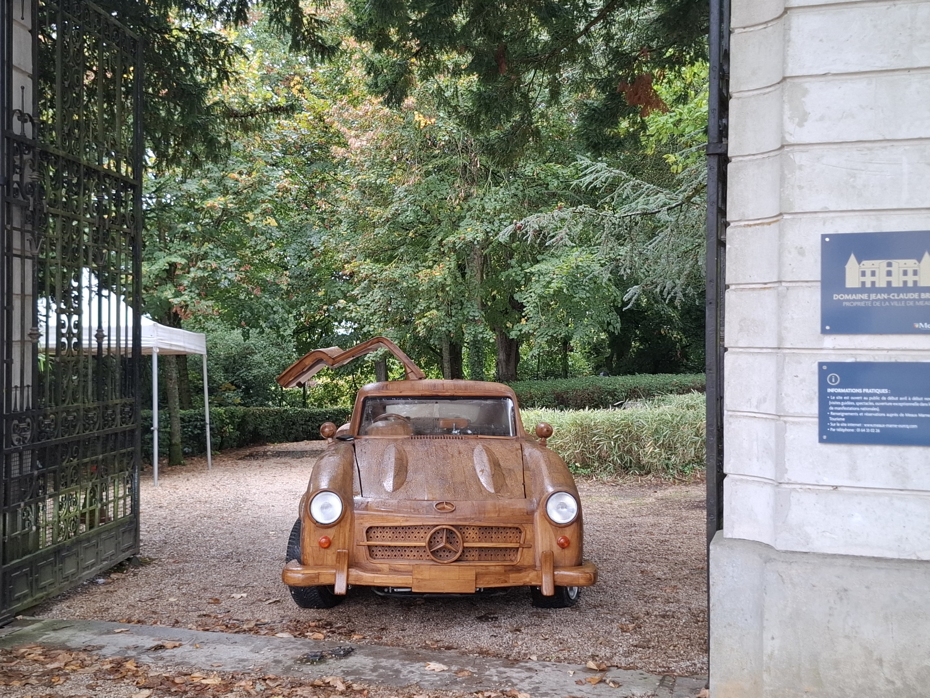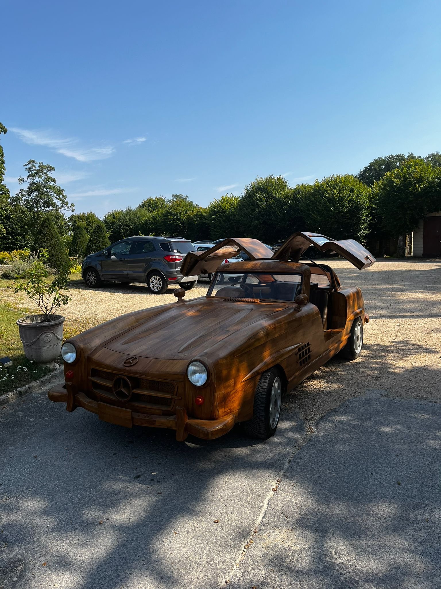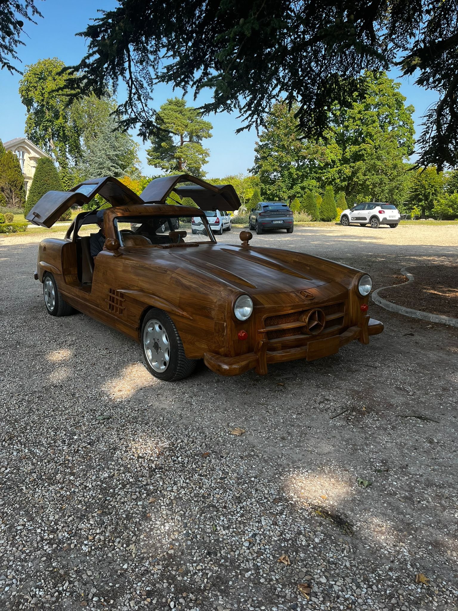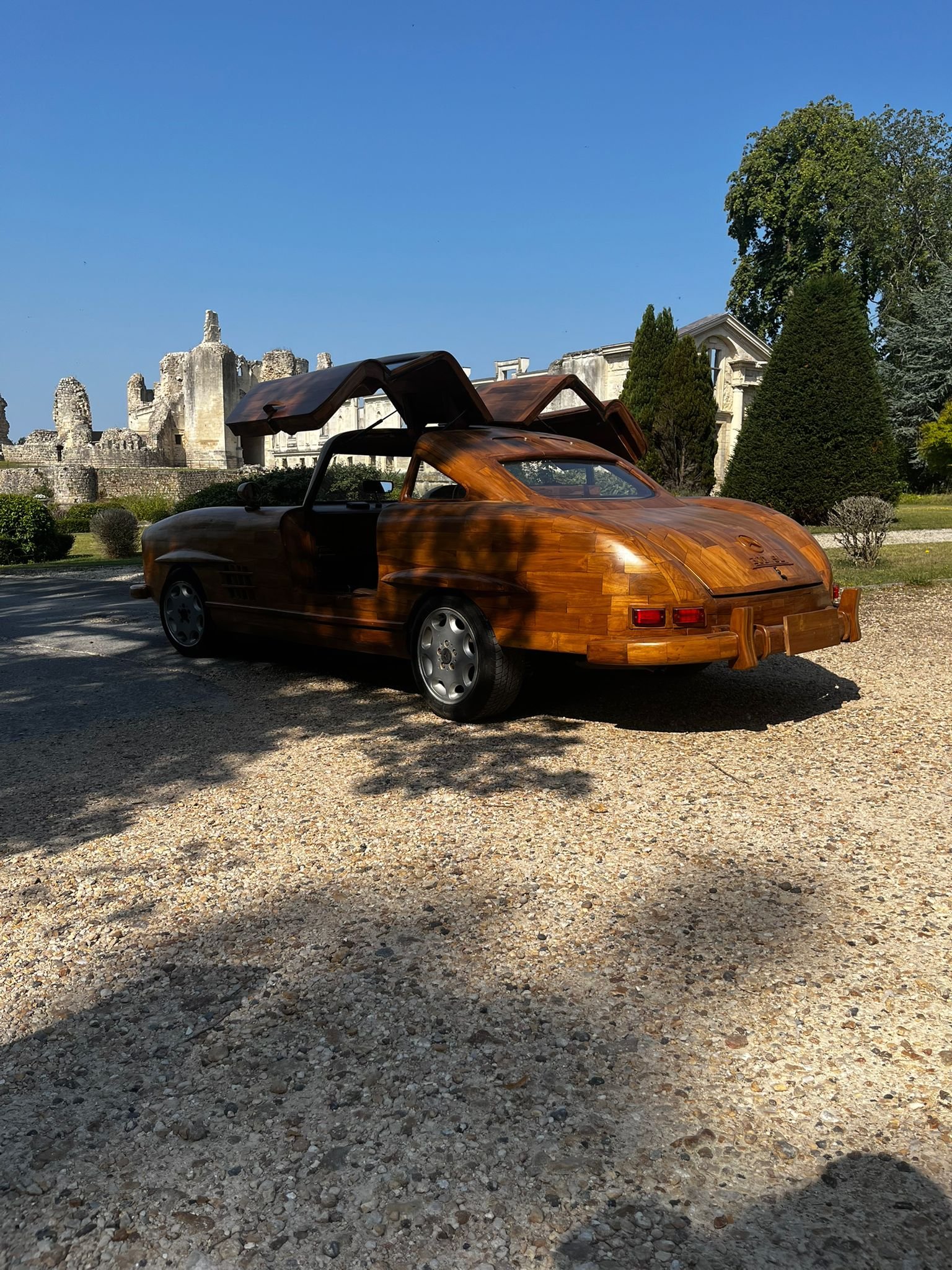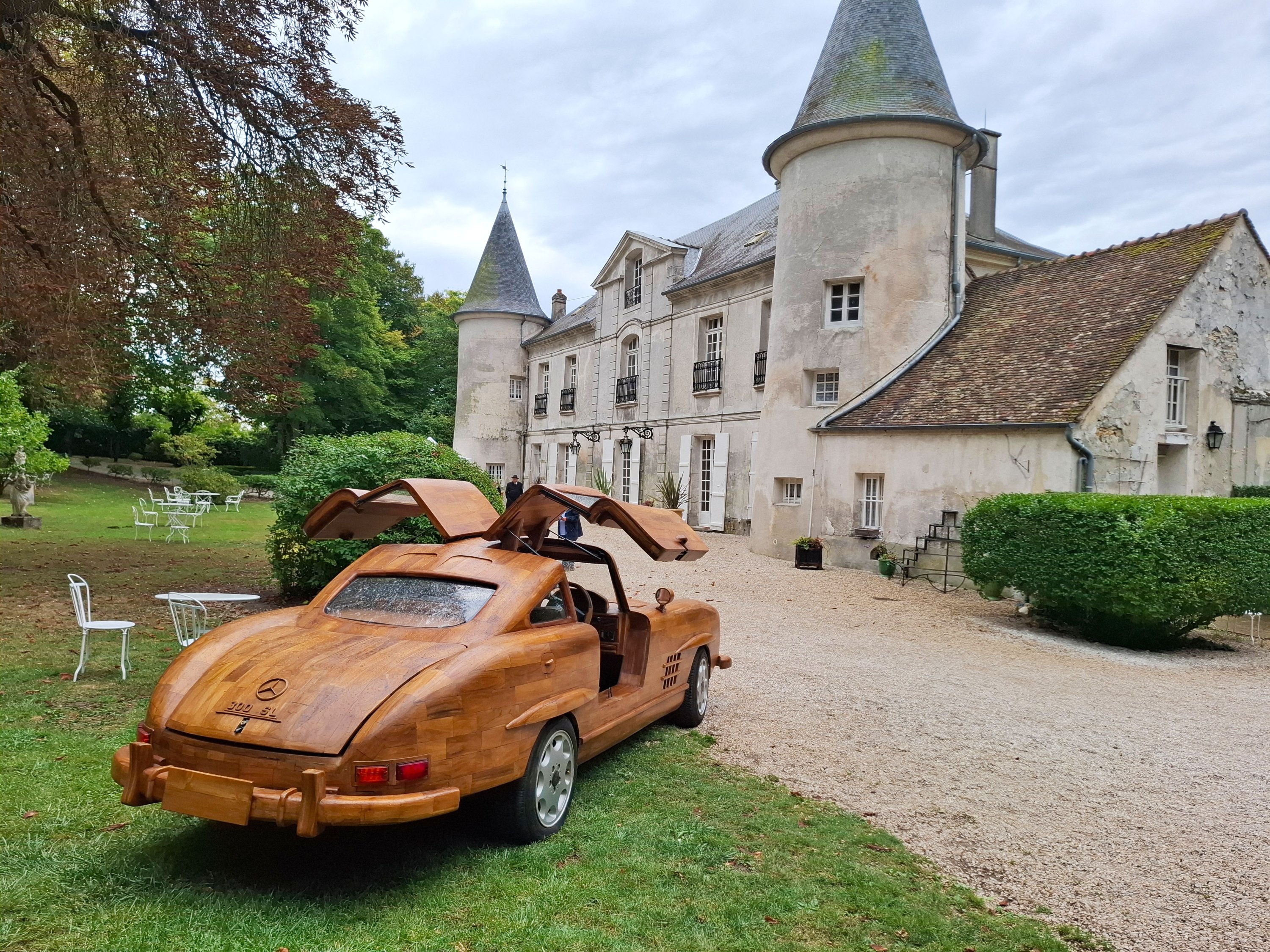 "La seule Mercedes 300 SL en bois roulante au monde" est l'oeuvre de Rémi Le Forestier. Connu pour sa réplique du trône de Bokassa ou le bureau qu'il livre à Donald Trump pour la Maison blanche, l'ébéniste relève avec cette automobile un nouveau défi: conjuguer l'ébénisterie à la mécanique. 8 000 heures de travail ont été nécessaires au XXIe siècle pour reproduire le modèle emblématique de la marque à l'étoile, produit entre 1954 et 1963. Equipée d'un moteur 6 cylindres de 3 litres, la "300" abat le 0 à 100 km/h en 8,8 secondes avec un équipement de pointe pour l'époque: châssis tubulaire, alimentation par injection puis freins à disques dès 1962. Baptisé la "Belle Castelle", cet exemplaire s'inscrit dans la production de voitures en bois. Elle se présente ainsi comme l'héritière de l'Hispano-Suiza H6 B Nieuport Tulipwood de 1924 commandé par André Dubonnet, ou de la 2CV de Michel Robillard vendue au château d'Artigny le 4 juin 2023.