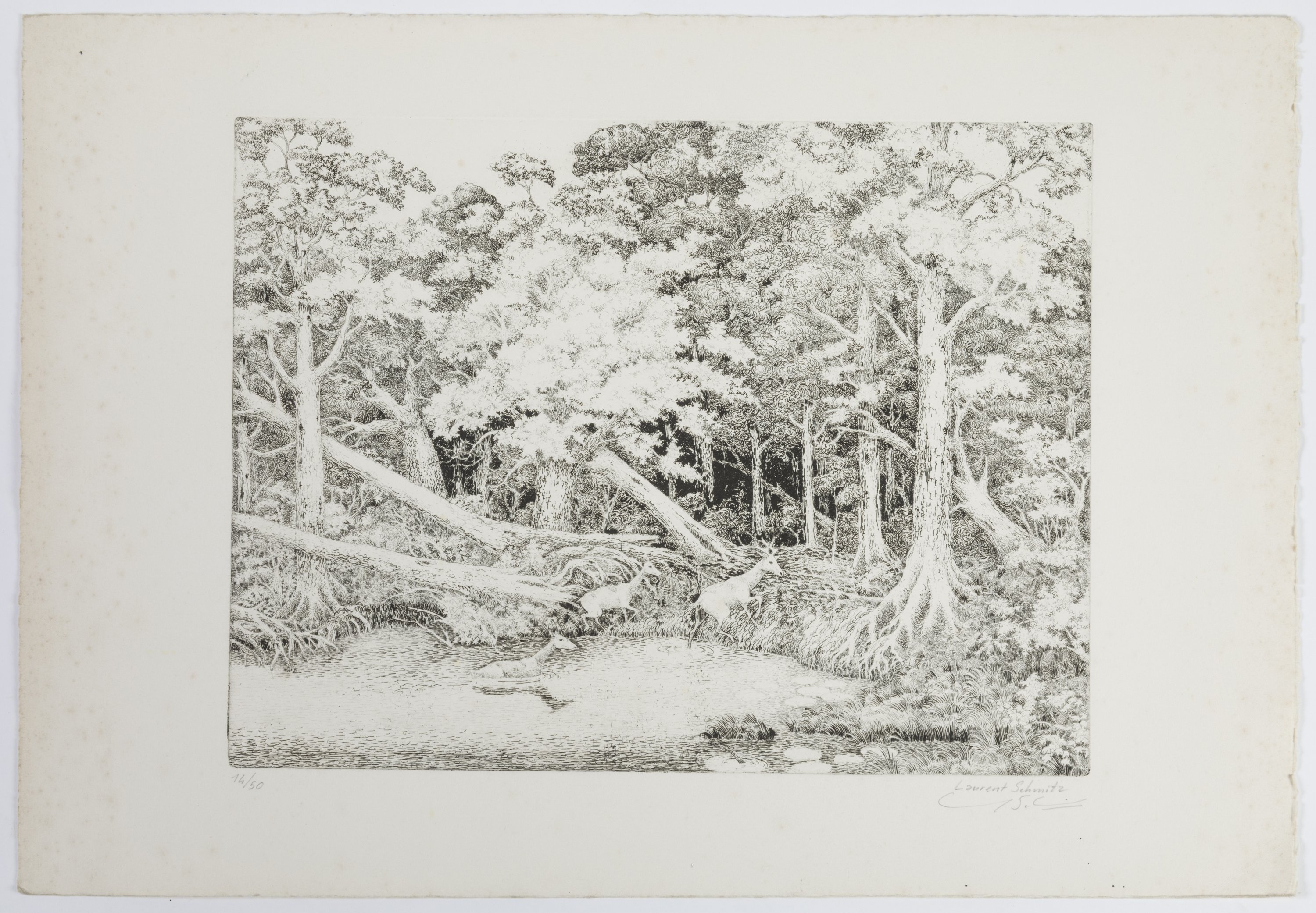 - Laurent Schmitz (XXe). Les cervidés dans un sous-bois. Gravure. Signée et justifiée. La feuille: Haut. 376 Larg. 530 mm.