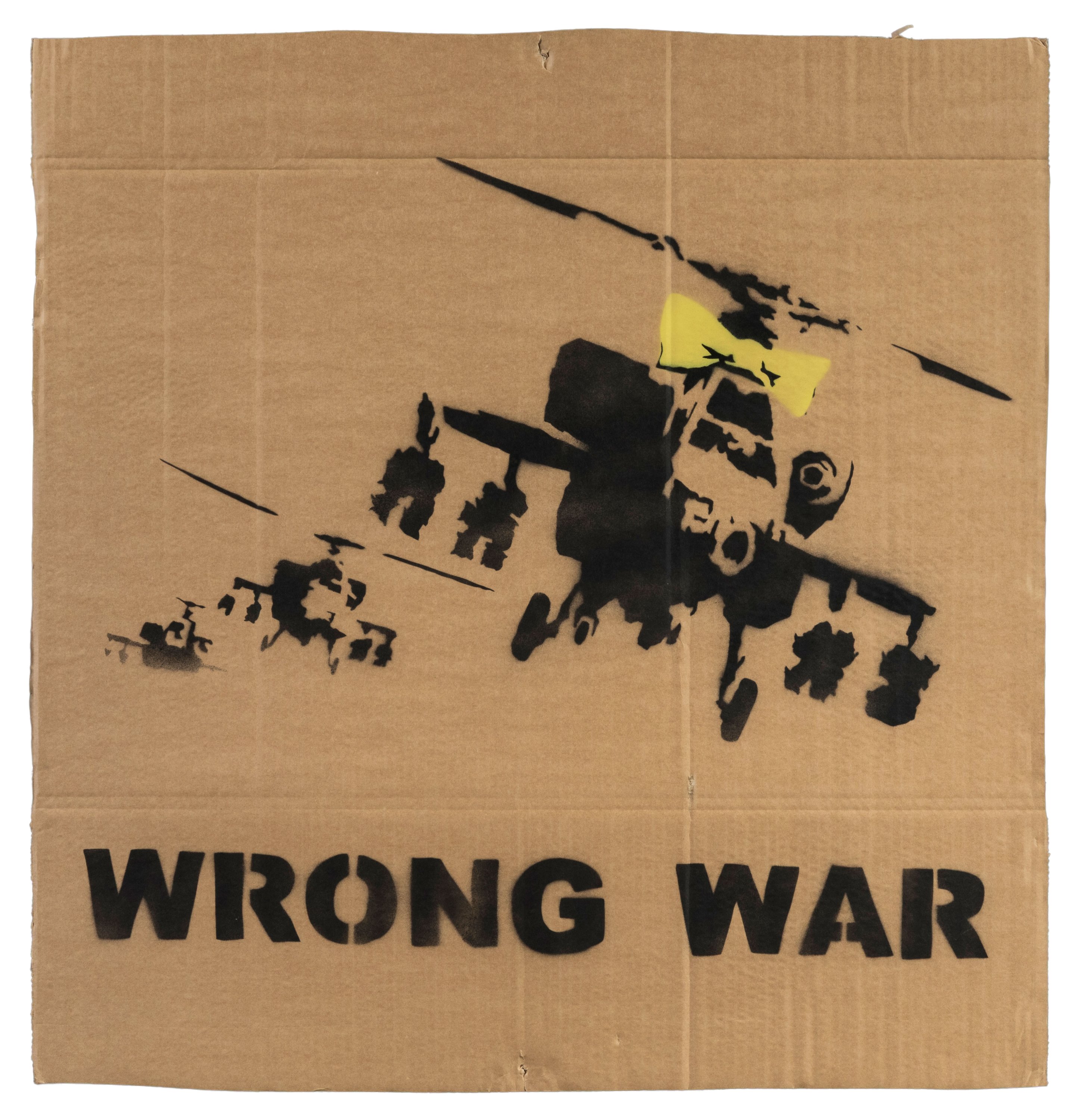 Réalisé au pochoir à l'occasion des manifestations dénonçant la "mauvaise guerre" d''invasion de l'Irak par une coalition internationale dirigée par les Etats-Unis d'Amérique, le panneau "Happy Chopper" met en scène des hélicoptères de combat affublés d'un noeud décorant habituellement les coiffures des petites filles.