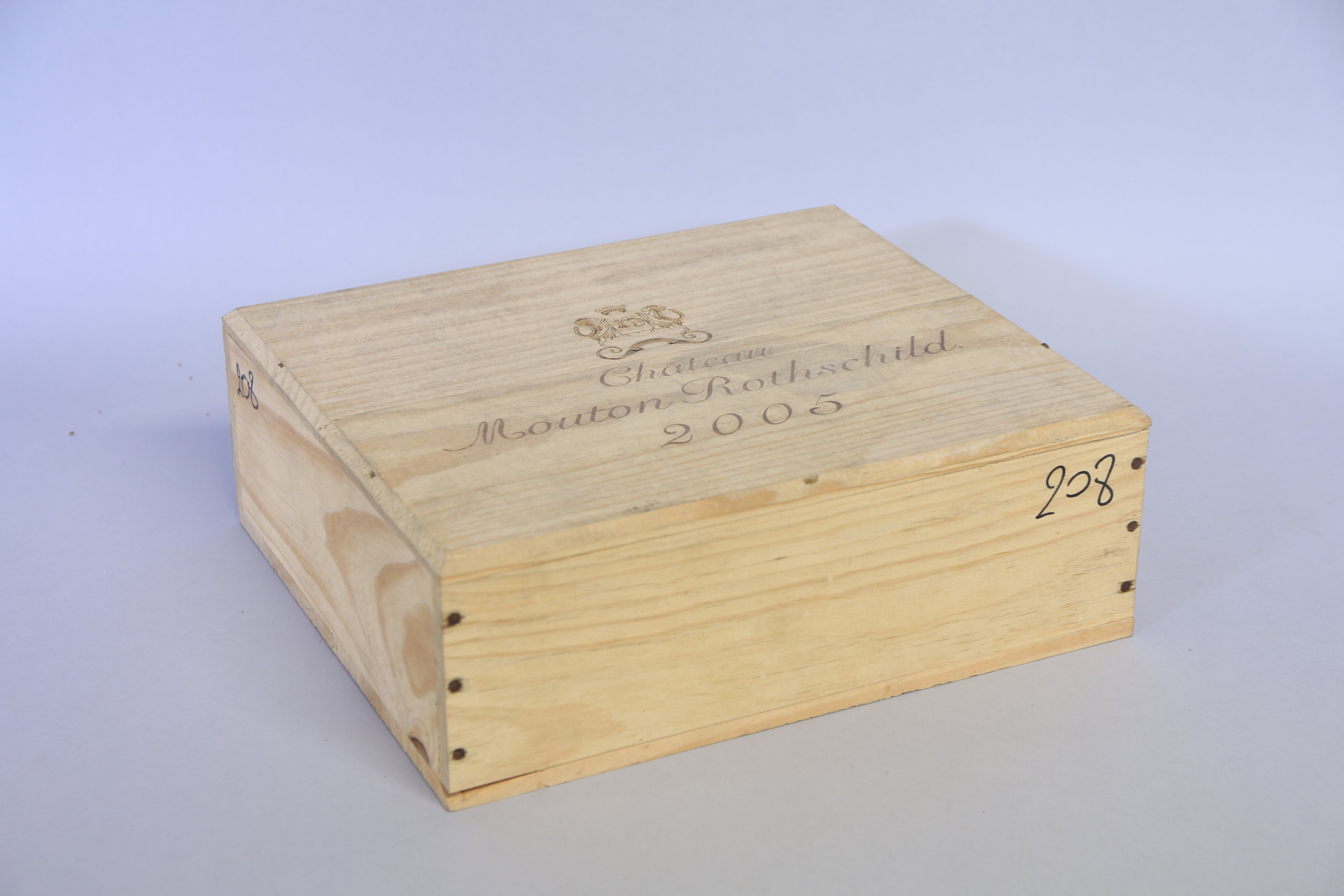 Pauillac, Château Mouton Rothschild, 1er Grand Cru classé, 2005, 3 bouteilles. Caisse en bois d'origine (numérotation au feutre).
